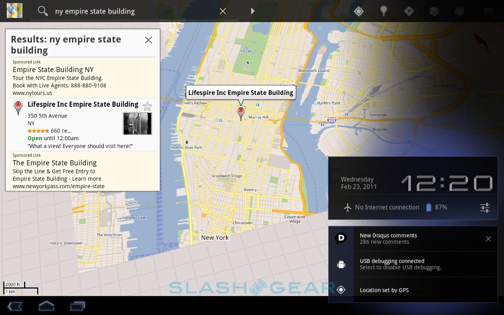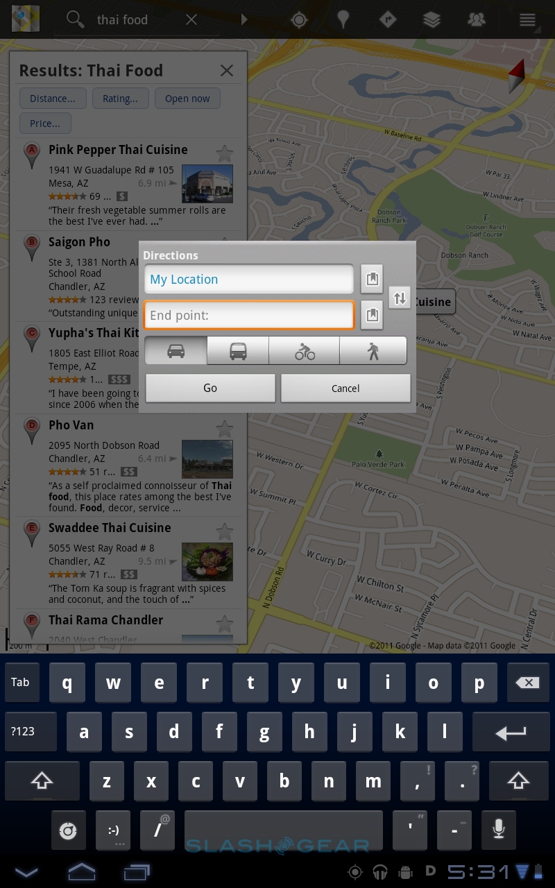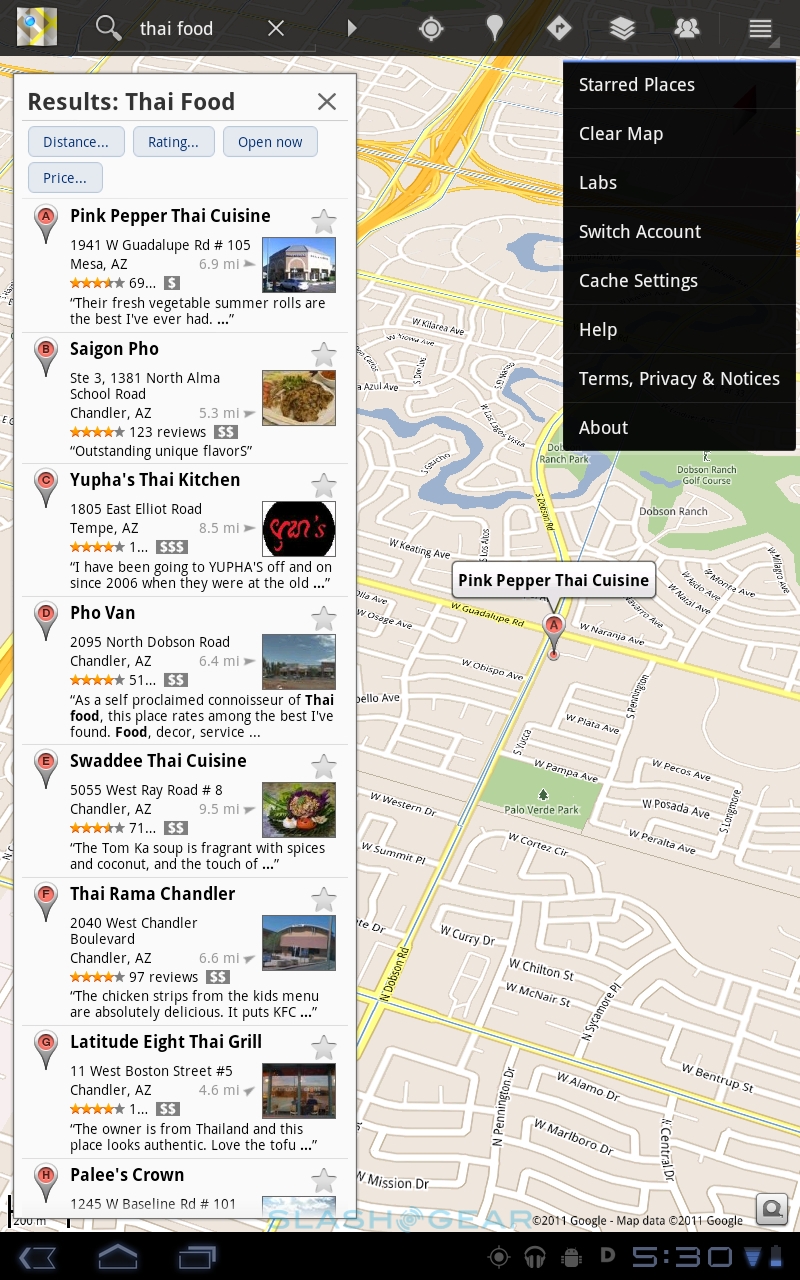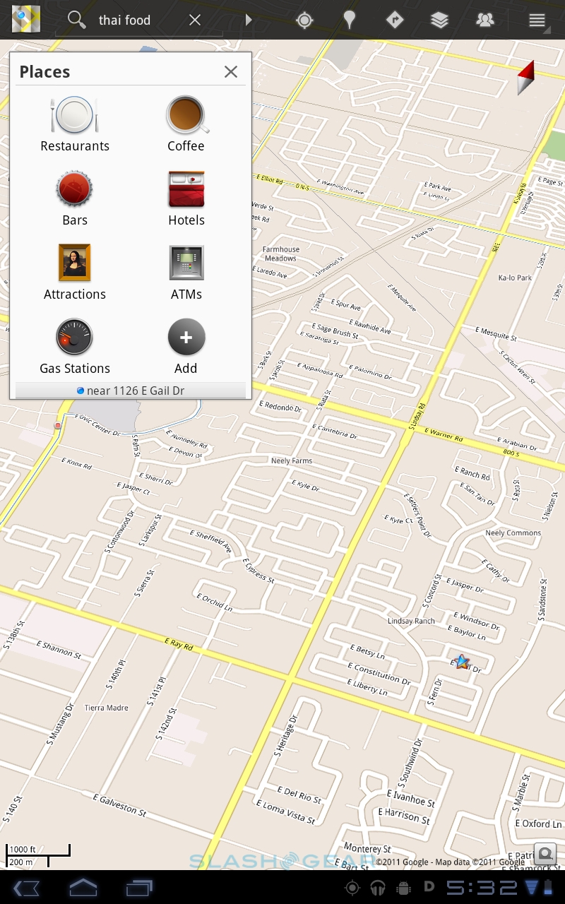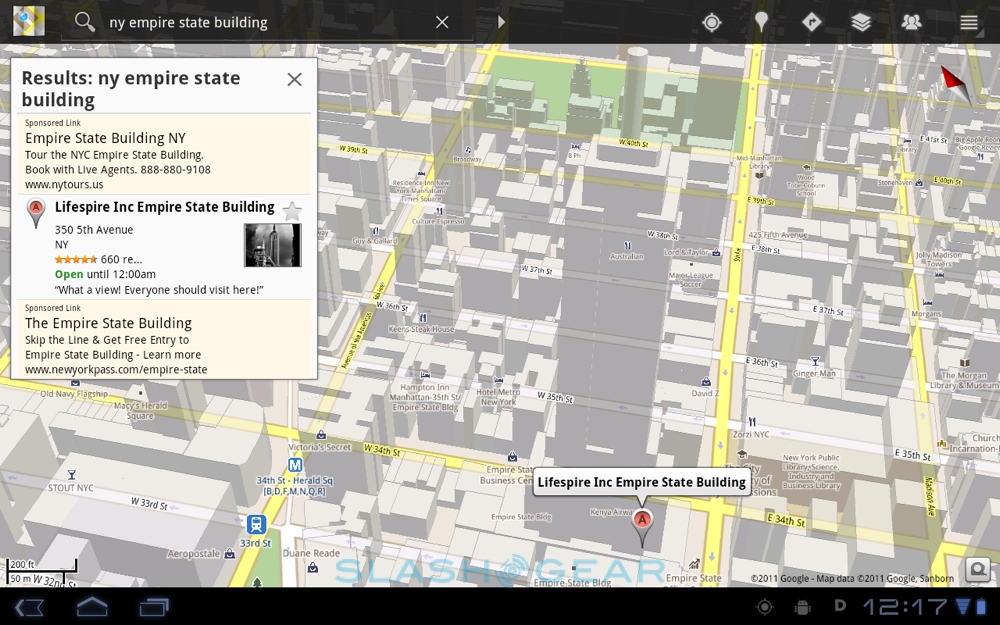 As we saw in the most recent Google Maps update on Android smartphones, Google has done a lot of work slimming down data use for its mapping app, and that's carried over to the Honeycomb version. The app renders dynamically, rather than using vector-based imagery, which adds up to quicker graphics and less data traffic. As a result, there's now room to cache common or frequently searched journeys, allowing you to browse those routes even without a data connection. It might not be so useful on a tablet as on a smartphone, but it still works well and Google's 3D buildings look great on a bigger screen.