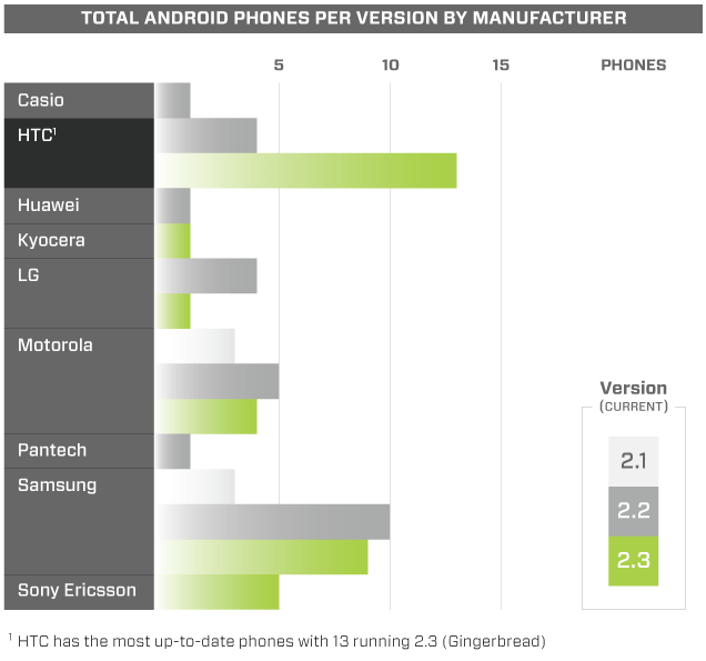 What we can see here though, is the chart showing the numbers showing who is winning the race. First of all there's a tracking of the total number of phones running Android 2.1 Eclair, 2.2 FroYo, and 2.3 Gingerbread across the board. It is HTC who is both winning with 13 devices on Gingerbread and is the only manufacturer with devices both on 2.2 and 2.3 where Gingerbread beats out their FroYo selection (and by 9 devices, no less.) Then there's Samsung in second place with 9 devices on Gingerbread (and 10 on FroYo), and Sony Ericsson followed closely by Motorola with 5 and 4 devices on Gingerbread respectively. In the chart we're seeing here from Shapcott, Pantech, Huawei, and Casio are also included though they don't appear to be part of the alliance. They're all tied at 1 device, each of them on FroYo.