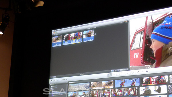 Then there's Movie Trailers, you can turn a list of ad-libs into a high-quality movie trailer list, aka you're the director, your sister is the grip, and your dog is the star! It gives you suggestions for how the trailer aught to look for what kind of movie you intent to make, and you've just got to plug in movies you've filmed or made! Keywords for videos help you out with this, allowing you to see clips of your movies organized by "Group" or "Action" or "Closeup" plus lots more. Very simple drag-and-drop interface as it's always been on iMovie, very quick on whichever machine they're using in this presentation. Absolutely no loading time at all. And poof! The trailer they've created is epic, fades in and out, correct timing and everything. Impossibly easy to use, takes out the job of the human almost completely. Themes can be anything from a blockbuster hit to a fun friends adventure.