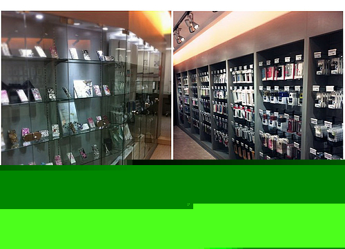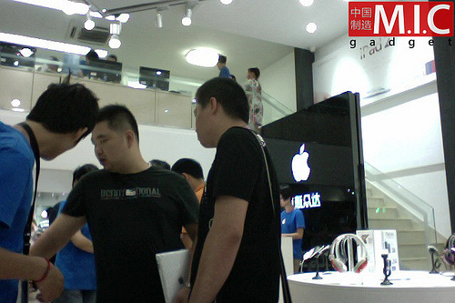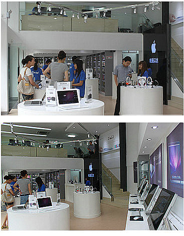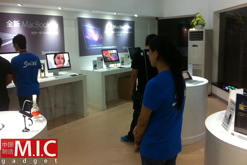 The two story building has a full glass facade with a large canopy and a huge glowing Apple logo. MacBook, iPhone, and iPad banners are plastered throughout the large interior space. Employees wear blue t-shirts similar to those worn by Apple employees but instead of the Apple logo, the shirts are printed with the Sinzd store name. Employees also help customers to jailbreak iPhones and iPads purchased from the store.