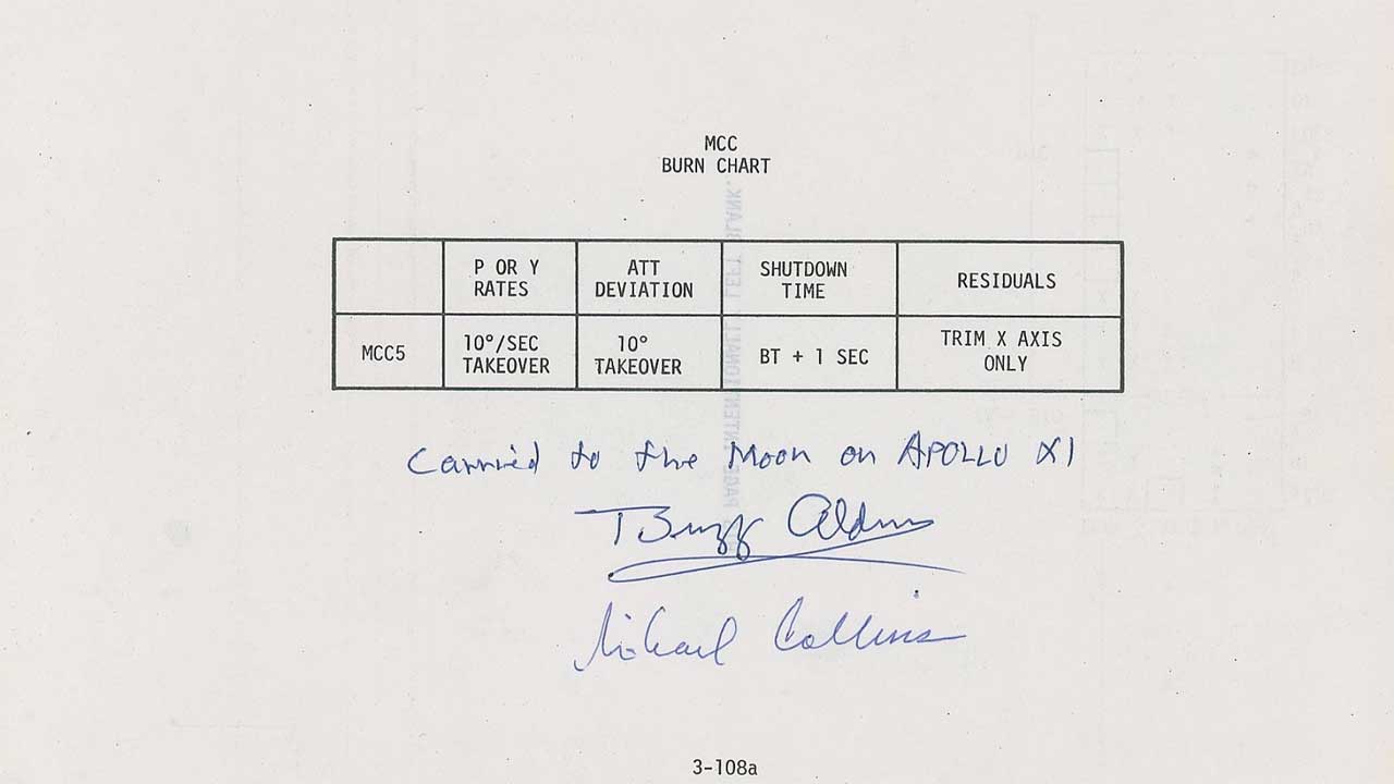 Along with the flag, the same auction house is also selling an Apollo 11 flight plan page that was flown into orbit on the Columbia Command Module. The page has an Apollo 11 burn chart and was signed and certified by Collins and fellow astronaut Buzz Aldrin. That page is expected to bring $20,000 at auction.
