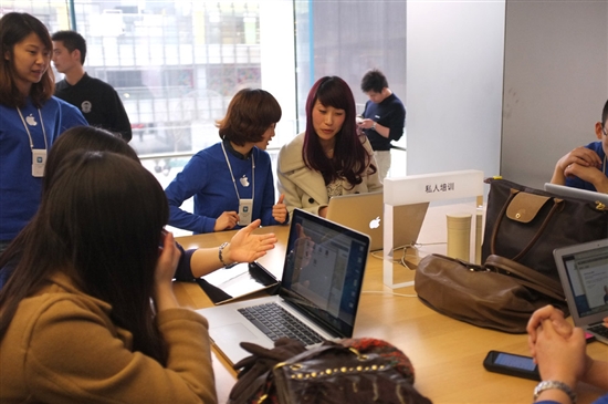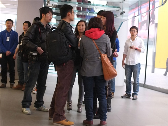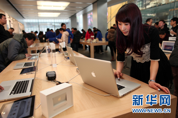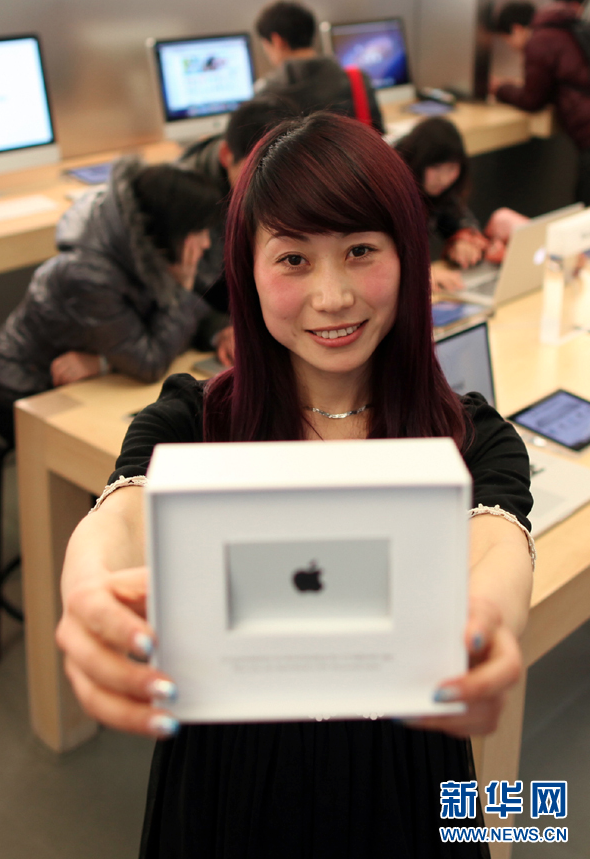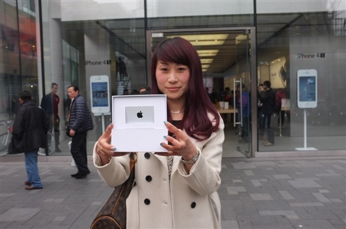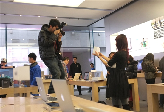 The local media in Beijing and Qingdao (and everywhere in between) now calls Fu the "Apple Girl" and has been seeking interviews with her all month. Images above and below show her taking her first tour of the Beijing Apple store. You'll also notice her carrying around a simple white box with her $10k USD gift card inside.