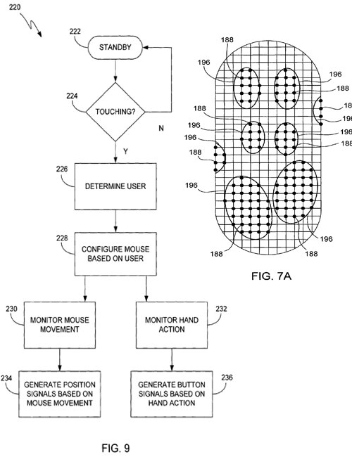 A new Apple patent application for an Ambidextrous Mouse has been submitted, describing a wireless, user-configurable mouse that could automatically recognize whether it was being held by a left- or right-handed user and adjust its virtual buttons and other controls accordingly. Perhaps more interestingly, however, Apple suggests that the peripheral could also be used to identify the current Mac user by the touch-pattern of their hand.