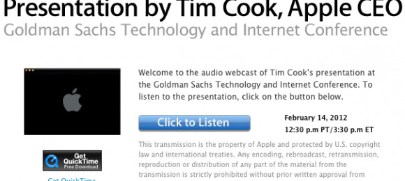 Today you'll be hearing more than a couple stories from the Apple world coming from Tim Cook as he speaks at a Goldman Sachs Conference for investors. This talk is being streamed live via QuickTime from Apple's own Investor website for anyone who'd love to take a listen to do so. This talk has covered supplier accountability, products, and the fact that Cook cannot live without his Apple TV.
