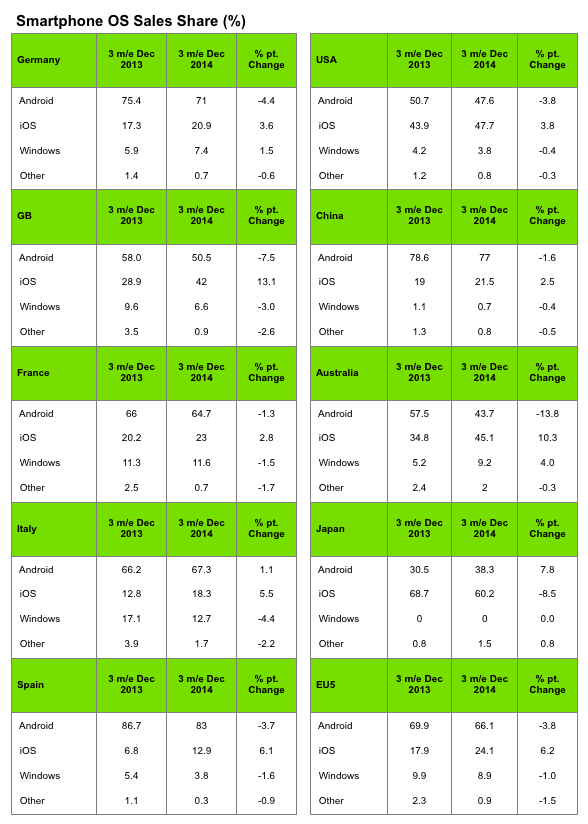 New smartphone sales data is in for the US looking at Q4 2014 from Kantar Worldpanel CamTech. The data from the research firm shows that Apple iOS lead the US OS share for the first time since Q4 2012 during the important 2014 holiday shopping season. The metrics show that Apple's sales grew market share in the US, Europe, and China during the quarter.