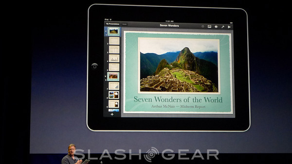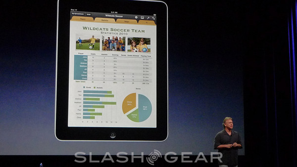 Meanwhile Apple have also developed a new iWork suite for the iPad, with three new apps: Numbers (spreadsheet), Keynote (presentations) and Pages (word processor) which will each be available for $9.99. All have been specially reworked for the iPad's 1GHz processor and to suit its UI, and support presentation animations and transitions, spreadsheet graphs and tables, and in-app image editing.