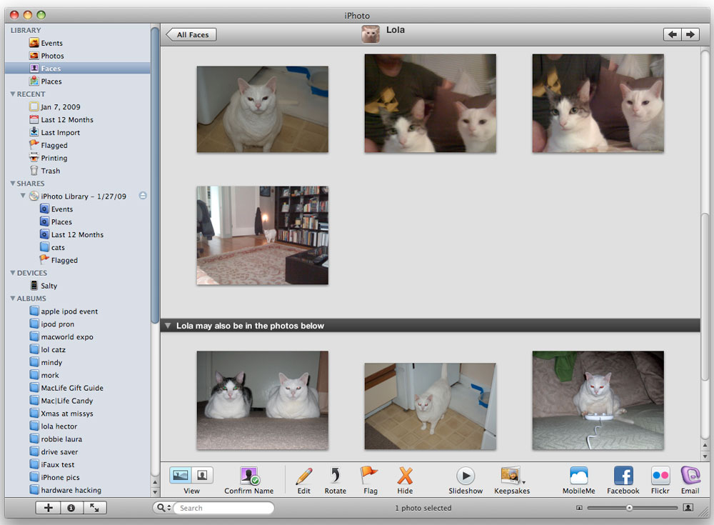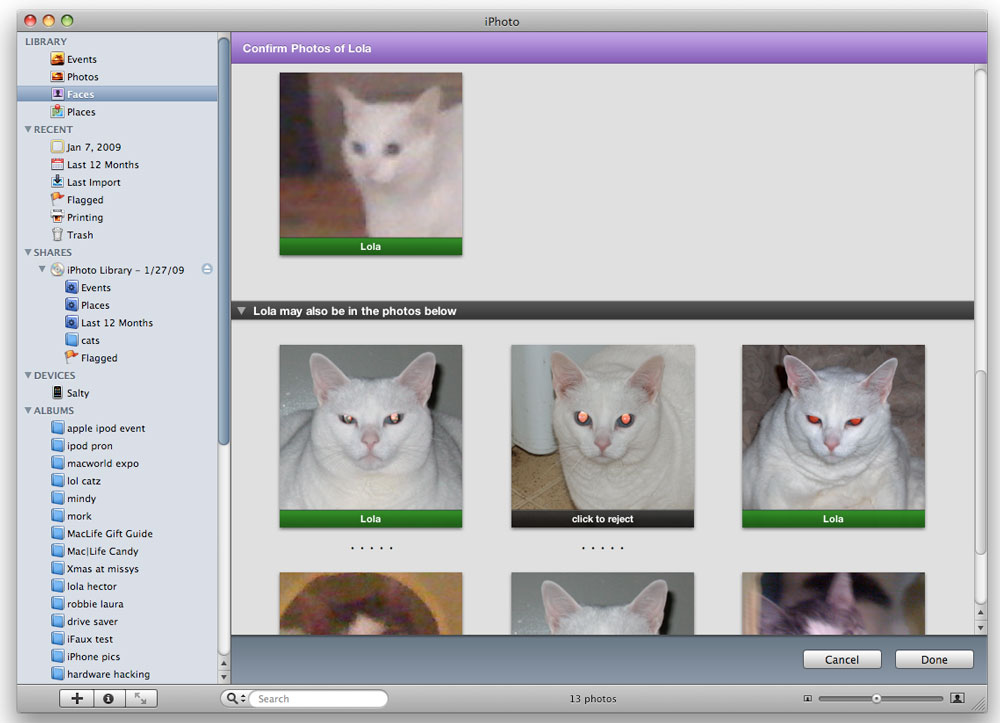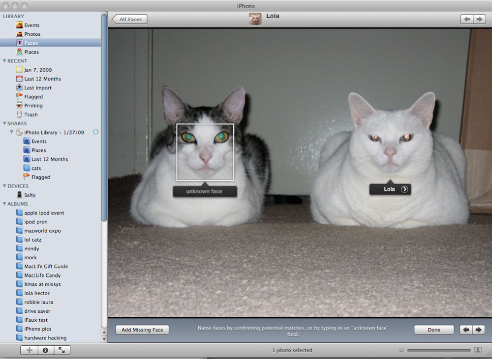 When Apple's Phil Schiller told us that the company had picked the best facial recognition software they could find for the newest version of iPhoto, he obviously wasn't kidding. Despite claims from the Apple representatives back at Macworld that iPhoto wouldn't recognize pets, early tests by MacLife suggests otherwise. The app was capable of spotting their test subject – Lola the cat – with just as high accuracy as humans, after a little manual training.