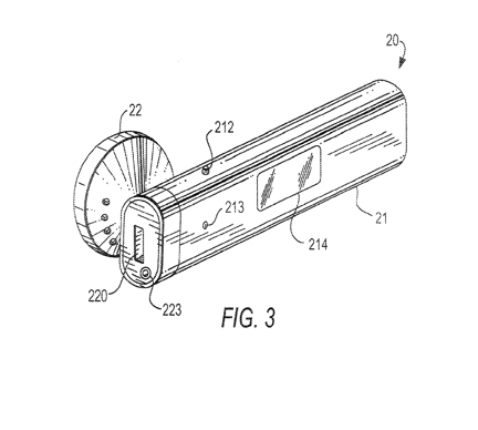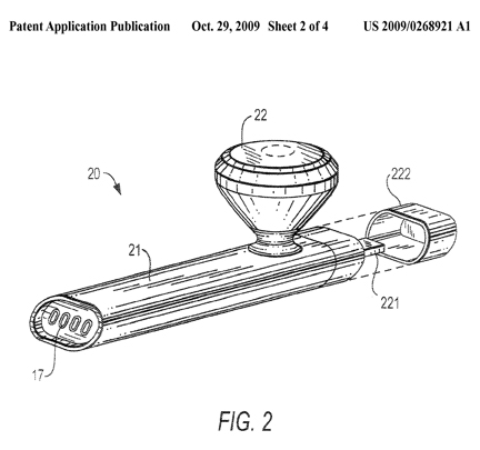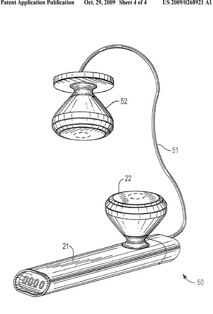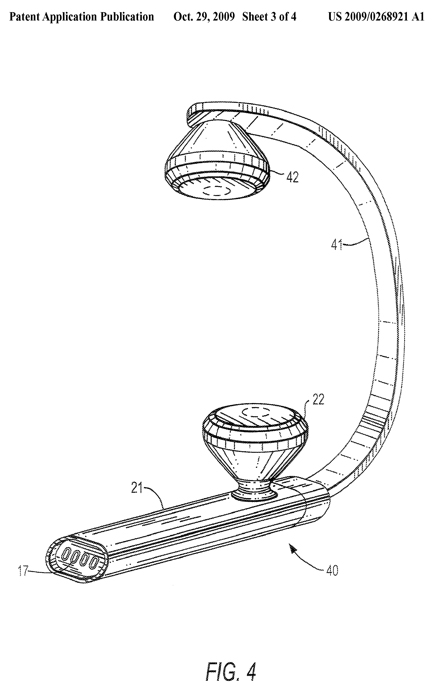 That storage would turn the headset into a full-blown iPod, similar to the shuffle. You would also be able to record voice notes, since it would have an integrated microphone, and of course it could be used for hands-free calling in the regular way. Apple's application also describe a form of basic automatic volume adjustment that would change earpiece volume depending on the ambient noise picked up by the microphone.