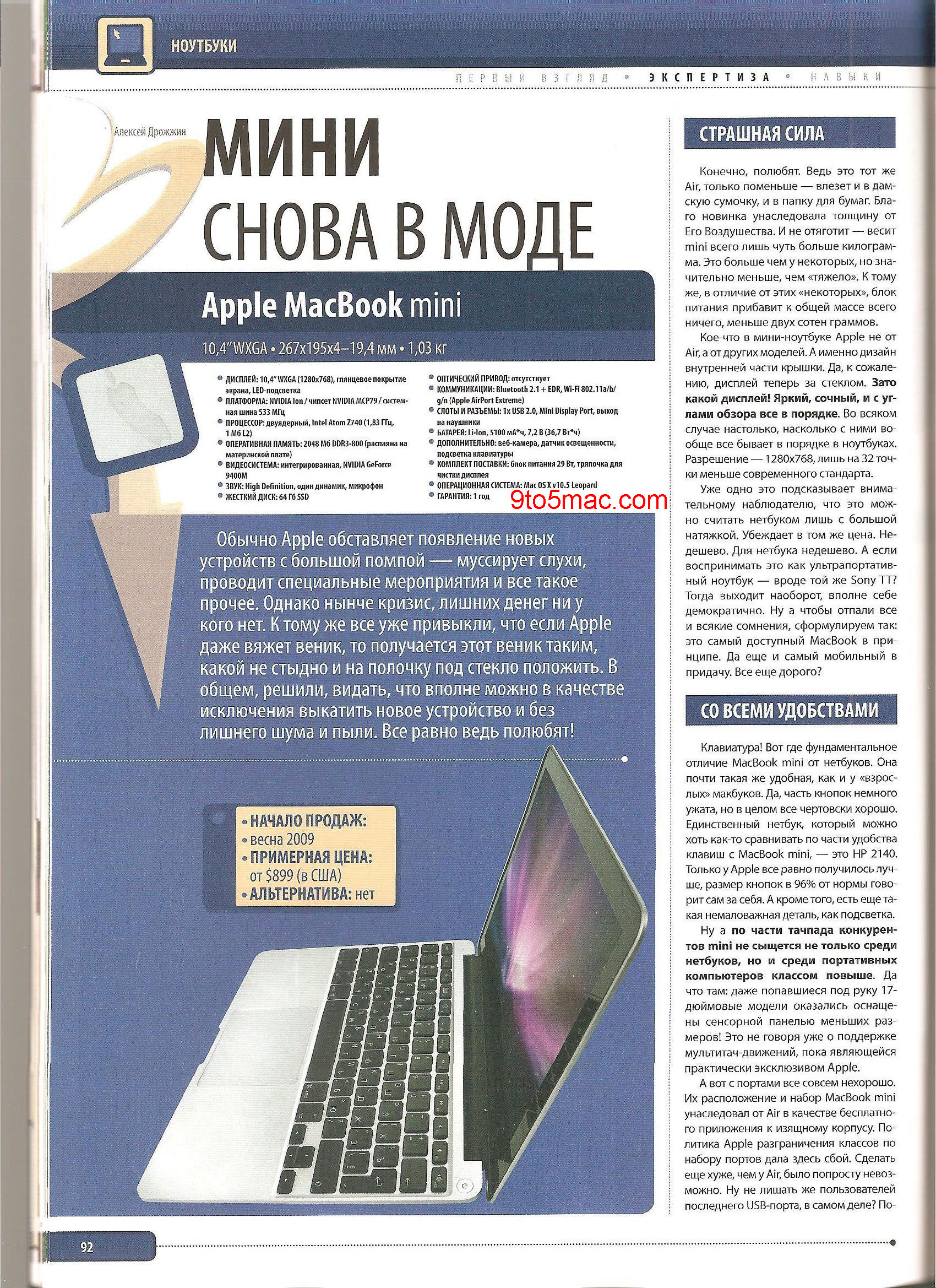 First things first, we're calling April Fools' Day on this. Nonetheless, someone has gone to some serious Photoshop effort for this MacBook mini as featured in a Russian magazine. Purported specs include a 10.4-inch WXGA display, Intel Atom Z740 1.83GHz processor (with 1MB L2 cache), 2GB of DDR3 RAM and NVIDIA GeForce 9400M graphics.