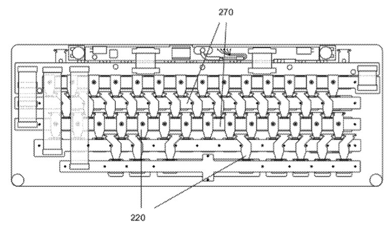 Apple has developed an ultra-slim keyboard design that would allow future MacBook Pro notebooks and others to be even thinner, delivering a layout both tactile enough to suit typists and compact enough for Apple's own design ambitions. Described in a patent application for a "Single Support Lever Keyboard Mechanism" the keyboard is "a thin profile peripheral input device that is both efficient and aesthetically pleasing" Apple writes, as well as opening up new aesthetic possibilities, such as keycaps made from silicone, wood, stone, glass or even polished meteorite.