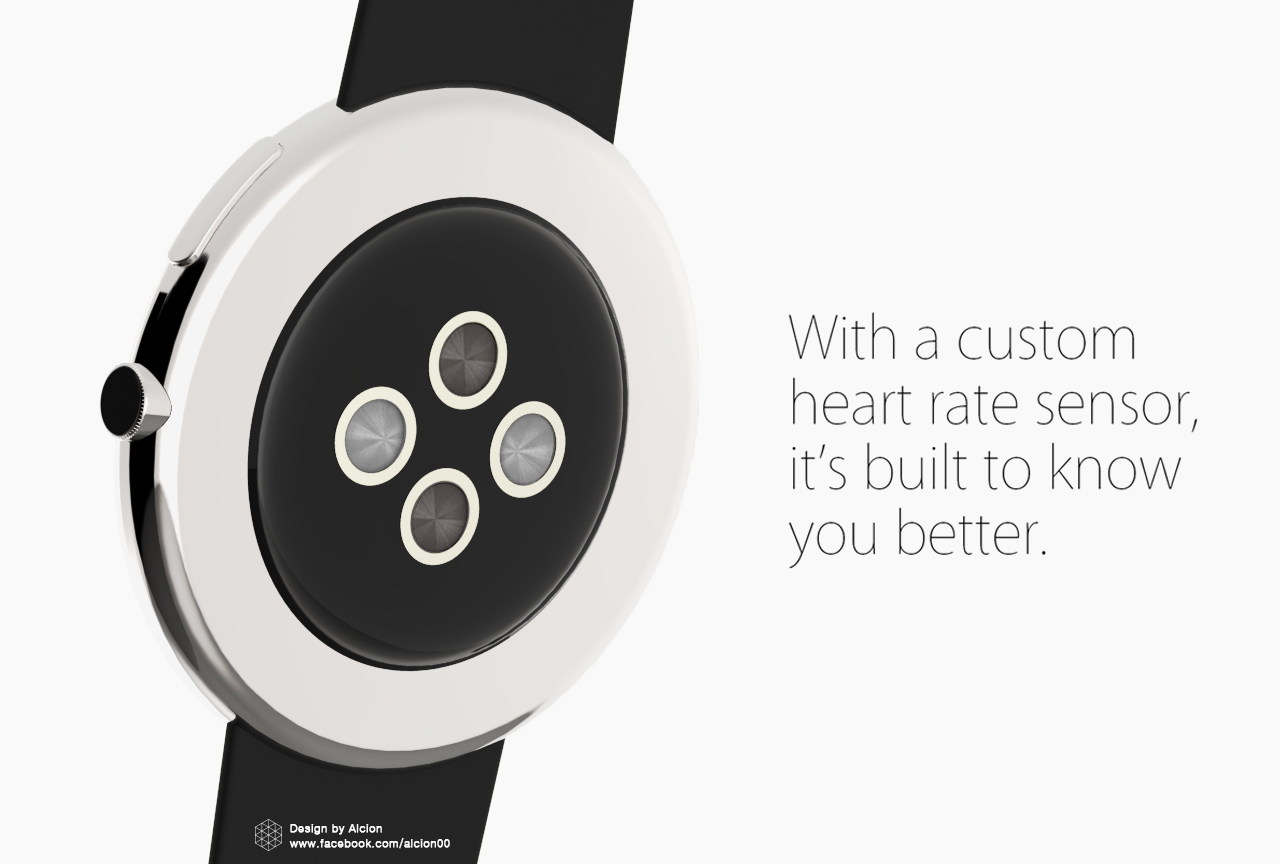 The crown is a touch different, and the lone hardware button follows the contour of the round frame, as well as the face-to-rear curvature. The bands look to slip into the body, and don't look to be interchangeable, which is something this concept doesn't address. The sensors on the rear are flat to the body, too.