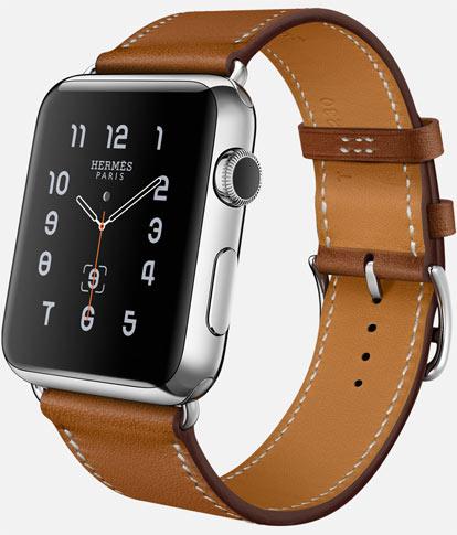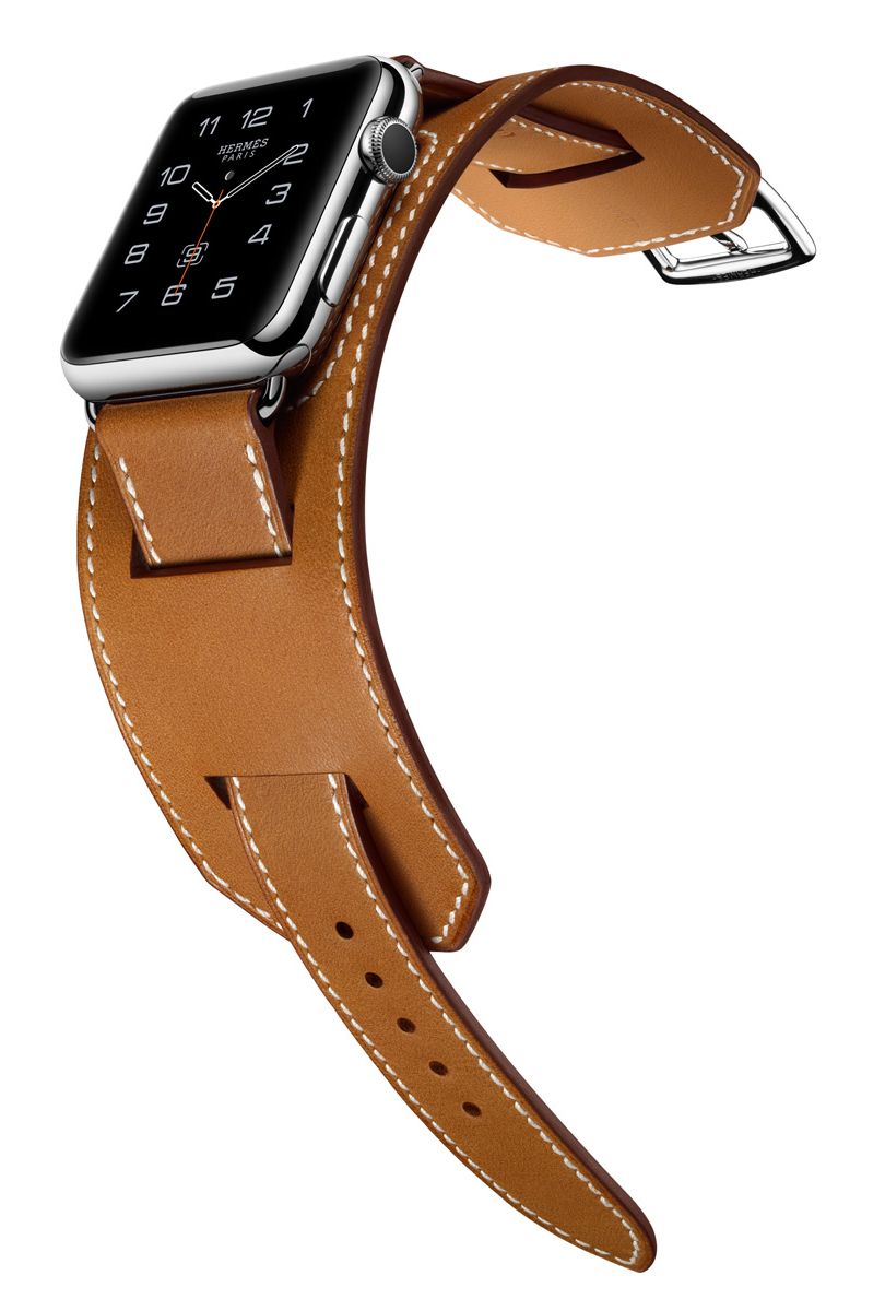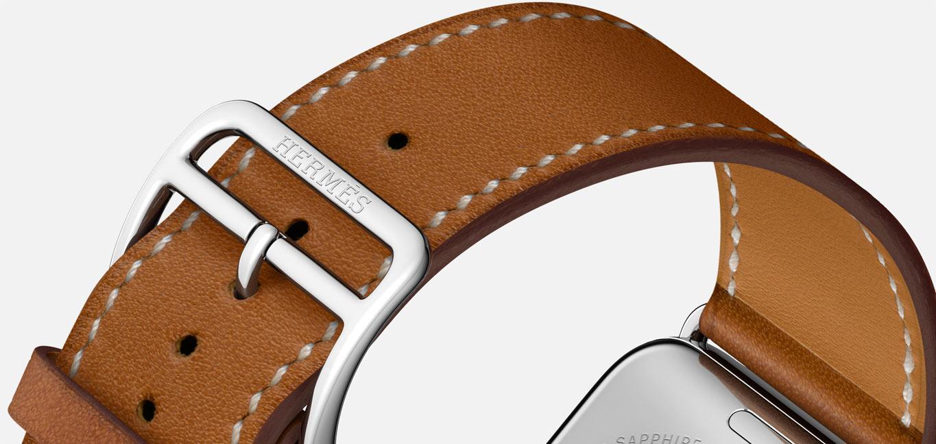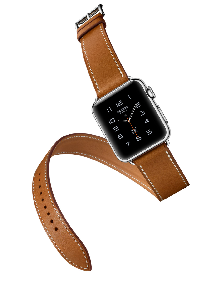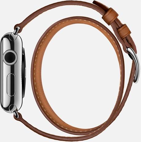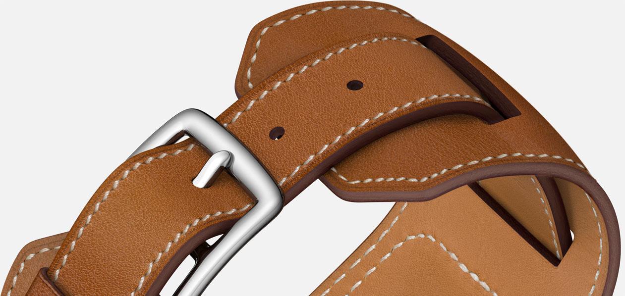 The Apple Watch Hermès edition offers three kinds of straps, some available in both 38 mm and the wider 42 mm bodies. The most ordinary looking is the Single Tour, which offers a classic watch band appearance, available in Fauve (brown) and Noir (black) for both the 42 mm and 38 mm stainless steel Apple Watch bodies. The smaller 38 mm also gets an additional Capucine (red) color.