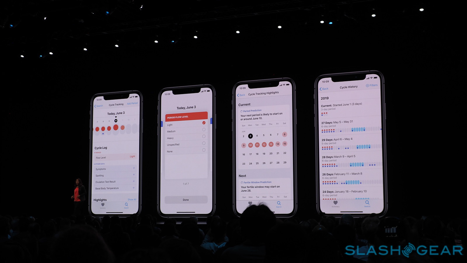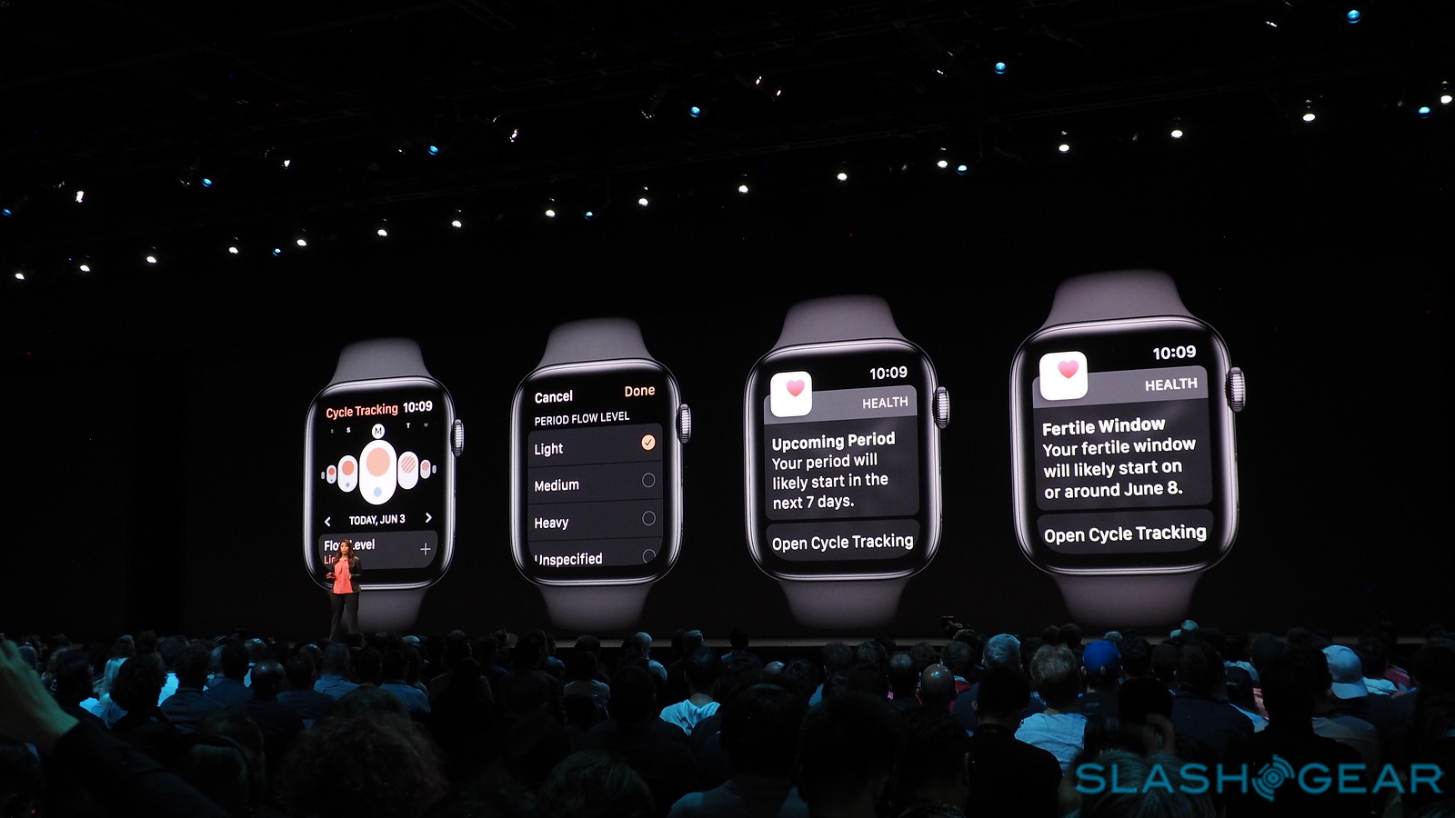 Cycle Tracking was shown for the first time, ever. That's tracking of menstrual cycles, if it weren't immediately apparent. The new system will allow a "simple, discreet way" for a woman to track her fertility. Period patterns, notifications, and reminders. This part of the watchOS update will be released this Summer (cross your fingers on that one).