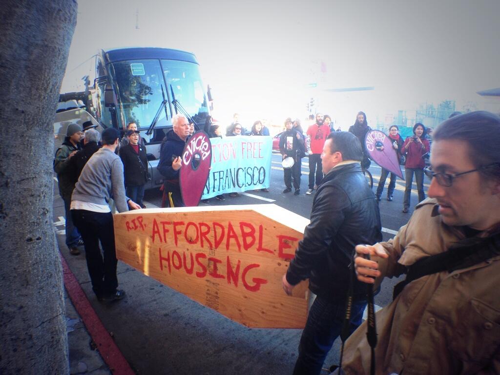 These protesters are attempting to make clear their anger at the major tech companies that've come into the area and started using these bus stops without paying cash to the local government for the privilege. These protesters also blame these companies for driving up housing pricing in the area by bringing in masses of employees that seem to be able to out-bit locals.