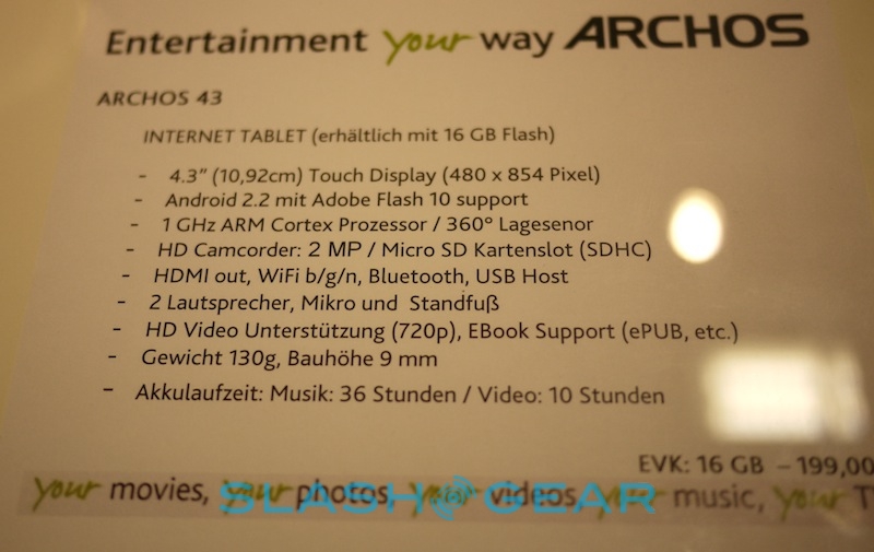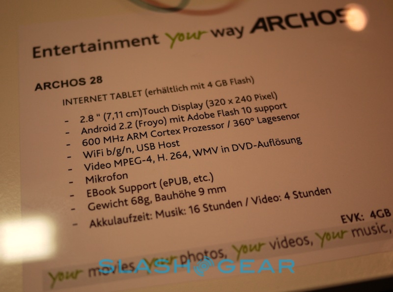 Though Archos' larger internet tablets grabbed our attention first, we spent some time playing with the French company's three smaller models too: the Archos 28, 32 and 43. Ranging in size from 2.8-inches QVGA, through 3.2-inches WQVGA, to 4.3-inches FWVGA, the three palm-sized tablets are Archos' attempt at hybrid PMP/MIDs, hitting price points from $99.99 to $149.99 to $199.