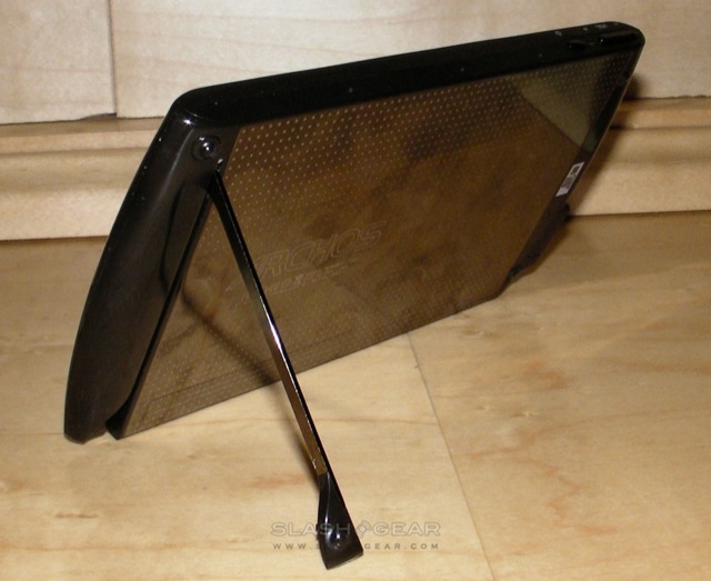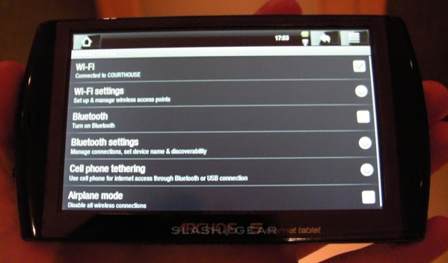 Stand-out specifications include WiFi b/g/n, Bluetooth (with straightforward pairing to your cellphone, for mobile internet access), a 4.8-inch 800 x 480 touchscreen (using a resistive, not capacitive, panel) and an 800MHz OPAP3440 processor. In use, the touchscreen lacks a little of the feather-touch precision we're used to from capacitive displays, but is still very sensitive for a resistive panel. The sort of sweeping gestures used to flip between the Archos 5's three homescreen panes are easily made, and the CPU keeps up with the widgets.