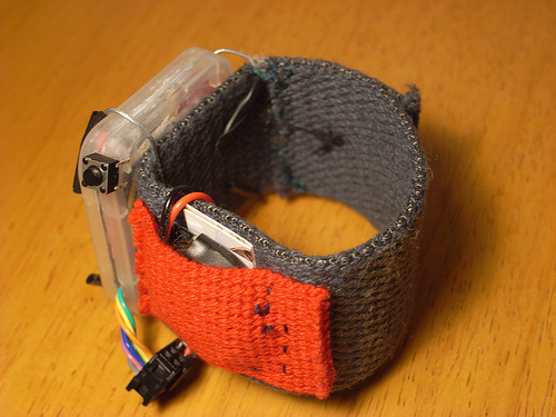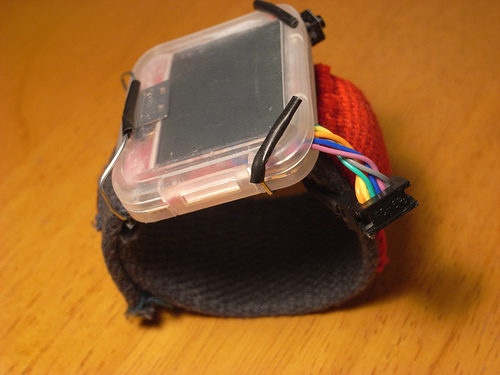 The knitted wristband is kept to the Arduino casing via bent paperclips, so hopefully Franklin won't be doing any strenuous exercise or jumping as it doesn't look the most stable of arrangements. More details on the Arduino Pro Mini here.