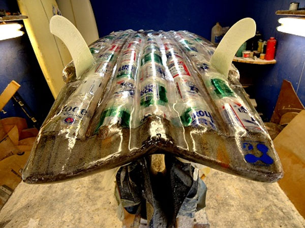 The board is long at 6'2" and uses a rocket fish design with two fins and a swallow tail. I wonder if they have actually tired the board out on the waves to see if it works. It looks really cool, but I wonder how comfortable it would be to stand on. It looks like the resin follows the curve of the cans so the board has ripples like a pool float would. This is a cool example of recycling trash into something green and useful.
