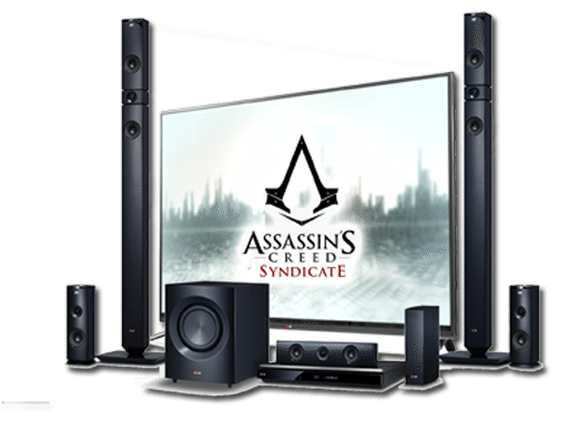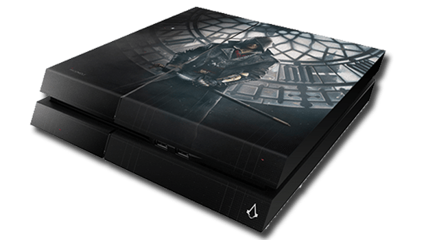 Below you'll see the Assassin's Creed Syndicate Gauntlet and Hidden Blade (a replica of the iconic Assassin weapon), a Home Theater System made specifically for this game's release, and a custom-skinned PlayStation 4.