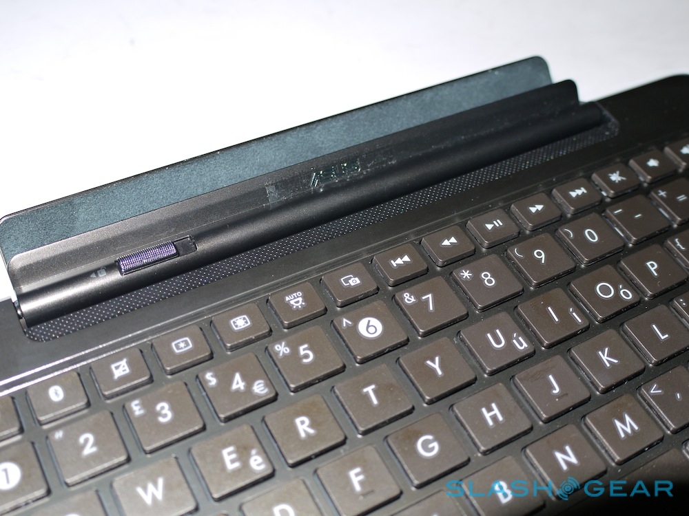 The keyboard adds a couple of extra USB 2.0 ports and a memory card reader, but more importantly there's an integrated battery. This promises to boost the slate's 9.5 hour runtime to a whopping 16 hours, automatically recharging the Transformer so that it's as close to full as possible when you later remove it from the dock. The supplied AC adapter has two plugs, allowing you to recharge both sections simultaneously. The battery adds the necessary weight to keep the whole thing stable when clipped together, adding up to a setup we far prefer to Acer's optional Iconia Tab W500 dock.