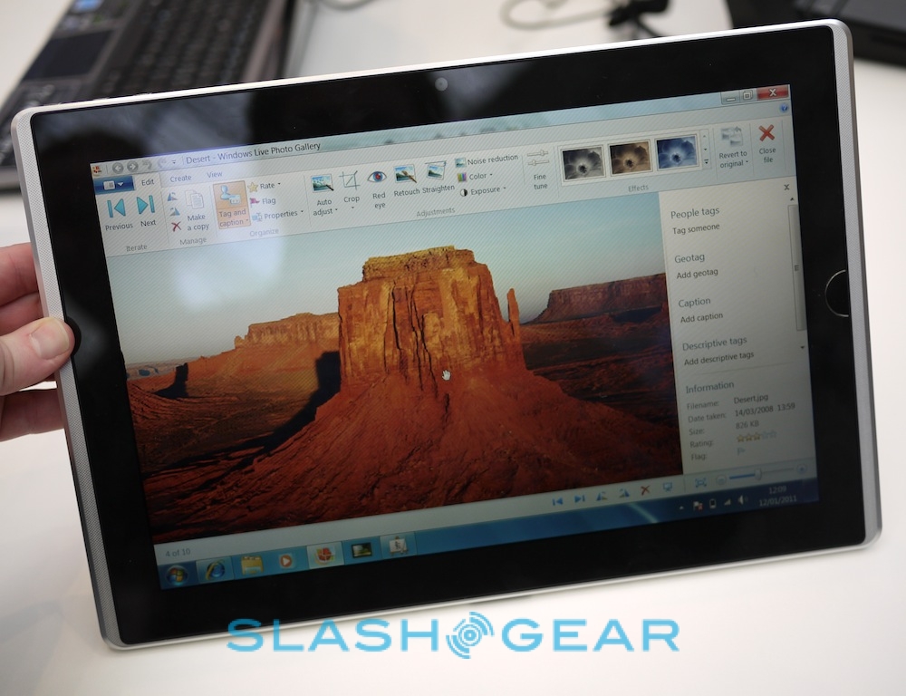 Inside there's WiFi b/g/n, Bluetooth and a 64GB SSD, along with HDMI and USB ports, but you also get a dual-mode touchscreen. That can respond to finger-input – including multitouch pinch-gestures for zooming – as well as an active stylus using a Wacom digitizer. It's a considerable step up from capacitive styluses, and while Steve Jobs may say any tablet with a pen has failed, the Wacom experience is considerably better for art, handwriting recognition (which, in Windows 7, has become quite polished and accurate) and more precise control. It also supports pressure recognition, which is handy for the pre-loaded ArtRage graphics app but will also work in more serious design software.
