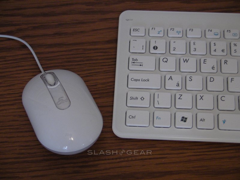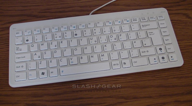 Using the included peripherals and a WiFi internet connection, you can reduce cabling to just two wires: power and one USB for the keyboard. The mouse, not entirely necessary if you're devoted to the touchscreen, can plug into a USB port on the keyboard; on the opposite side there's a pop-out stylus in a spring-loaded bay. ASUS' keyboard is surprisingly weighty and pleasant to type on. It follows the same isolated keys as first seen on some Sony laptops, and although lacking a separate numeric keypad the rest of the keys are full-sized. Several have Fn-triggered secondary features, including volume and music control, backlighting, sleep and WiFi, launching the webcam app, toggling through performance modes (more on that later) and changing the Eee Top's blue underlighting.