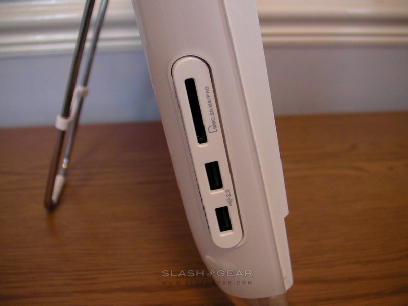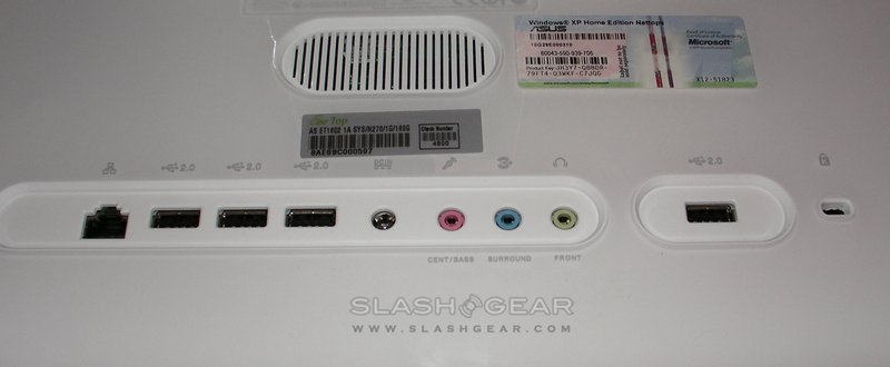 First impressions are positive. Despite the relatively budget price for the Eee Top, ASUS have managed to eke out more than a little style from its plastic casing. Held upright by a strong, spring-loaded metal leg, the body of the Eee Top is white gloss-finish plastic sitting in a transparent tray. Stand (and carry handle) aside, the nettop is just 4cm thick; along the back run gigabit ethernet, four USB 2.0, power, microphone, line-in and headphone ports, plus a Kensington lock hole. On the left-hand side there are a further two USB 2.0 ports, plus a multiformat memory card reader.