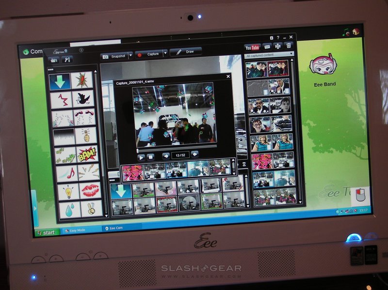 Also preloaded is a webcam app, that lets you record video and take photos using the Eee Top's 1.3-megapixel camera. Image quality is as mediocre as you might expect from an integrated webcam, but the app has a number of effects and animated overlays to brighten things up. These range from frames and color-effects, such as sepia, through Batman-style "Pow!" flashes, to being able to draw onto video and images.