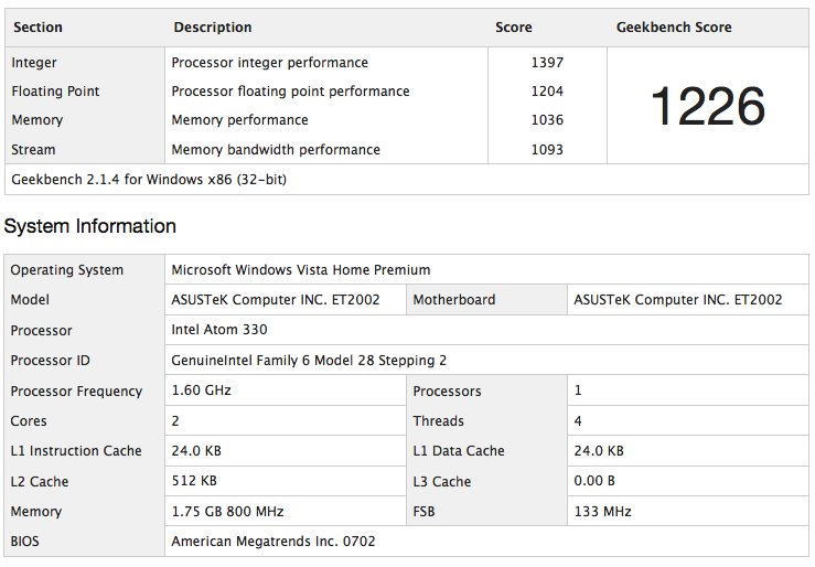 We ran the usual GeekBench testing to see how the dual-core Atom 330 held up, and as you might expect the ET2002 wasn't much of a fighter. Overall the nettop scored 1226, with memory-related performance holding back CPU performance slightly. In practice, applications load after a slight pause, and attempting to multitask with several browser windows, background media playback and Office open (ASUS preload a 60-day Office 2007 trial) led to some sluggishness.