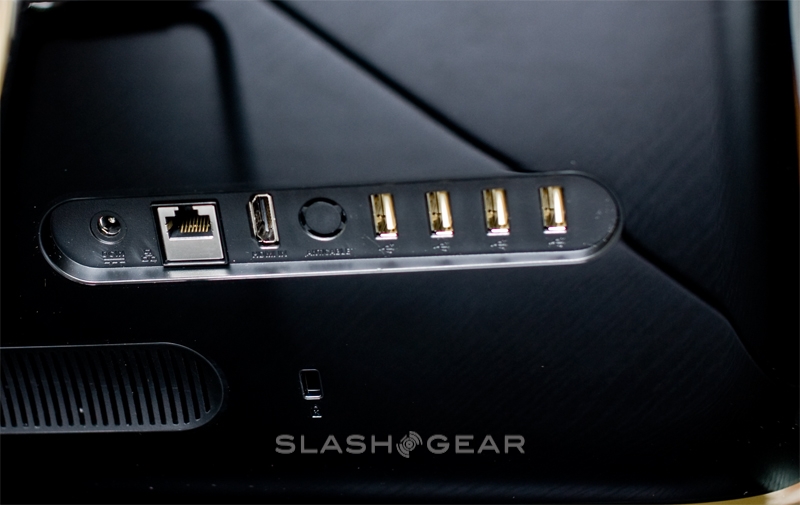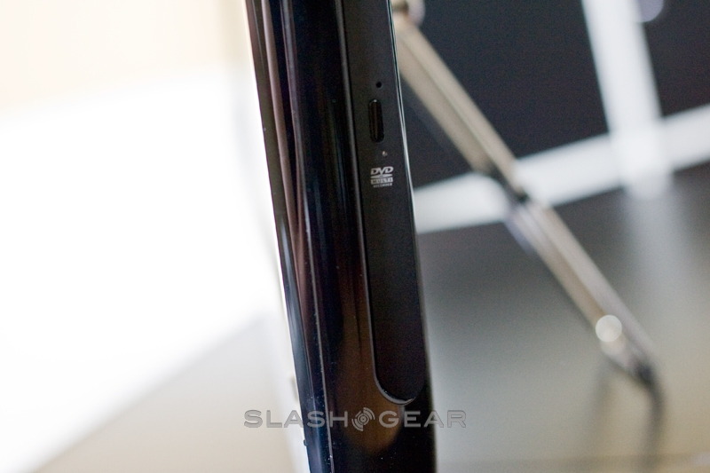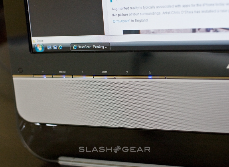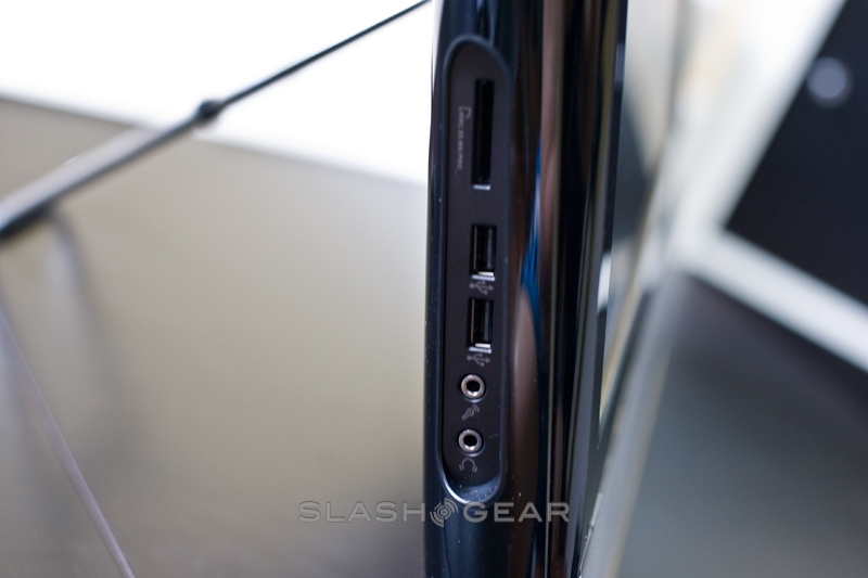 Physically, the ET2002 looks a lot like the ET1602, with a glossy black plastic casing that sits inside a smoked transparent plastic shell. On the back there's a sturdy, spring-loaded desk stand, four of the USB ports, ethernet and the power input, while the right-hand side has the tray-loading optical drive and the left-hand side gets the remainder of the ports. Running along the bottom edge of the LCD are a few control keys, including display brightness/contrast adjustments, power and a Home button that replicates the "Minimize All" shortcut. Beneath them, there's a grey grill hiding the stereo speakers, which didn't exactly blow us away with their audio performance but are good enough for casual radio and music listening, while up above the screen there's a webcam and dual-microphone array.