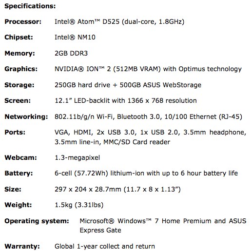 There's also WiFi b/g/n, Bluetooth 3.0 and 10/100 ethernet, along with USB 3.0 and USB 2.0 ports, VGA, a multi-format memory card reader and audio in/out. ASUS squeeze in a 1.3-megapixel webcam and a 6-cell battery apparently good for up to 6hrs of runtime, too.