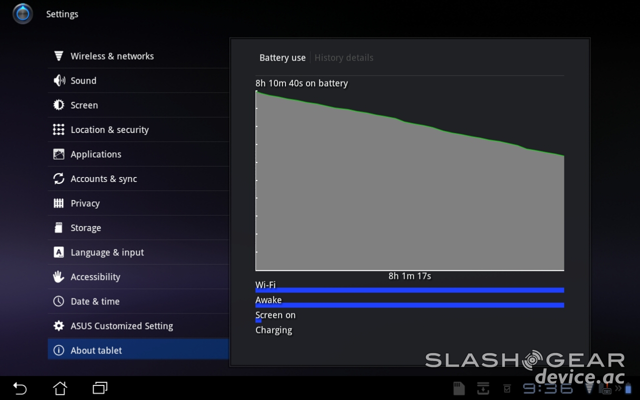 There's also to three modes in which you can work: power saving, balanced, and high-performance (aka normal). In our initial battery test, we stayed in Normal mode for the majority of it, and with it we're seeing something like 10+ hours with a large bit of that being screen off time. This is by no means the scale to judge the battery life by as it wasn't done under any kind of controlled set of rules, but it is a very basic peek at what we're likely dealing with here. Expect a vast improvement when we flip the power saving mode on.
