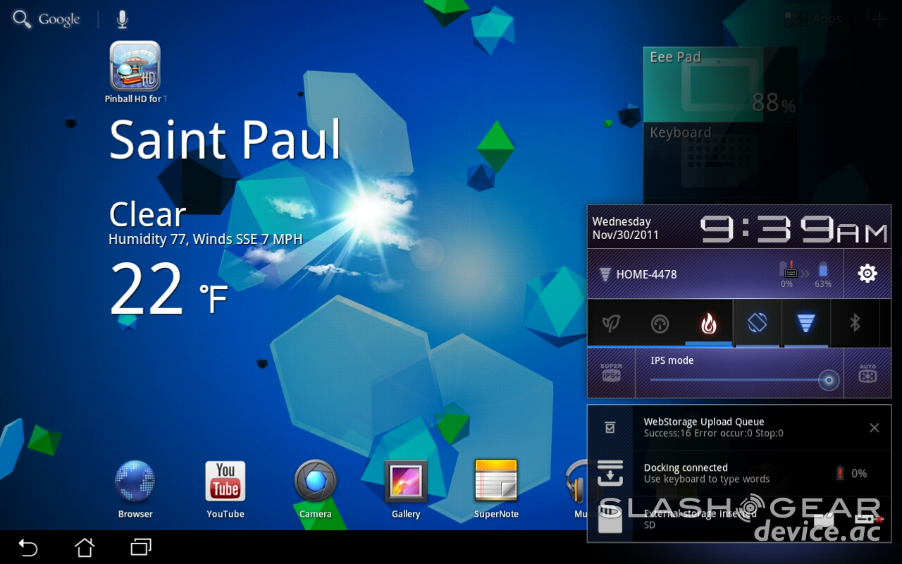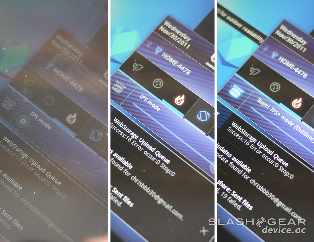 We won't go too deep into the products of the camera today, but know this: it's a vast improvement over most tablet-type camera toters your humble narrator has seen thus far. The camera interface remains mostly the same as your average Honeycomb shooter, as does most of the user interface, but ASUS has done an excellent job modifying the few bits that it has, including first of all the pop-up menu in the lower right-hand corner, it now including the all-important Super IPS button which will blast forth the brightness up to 600nits for outdoor reading.
