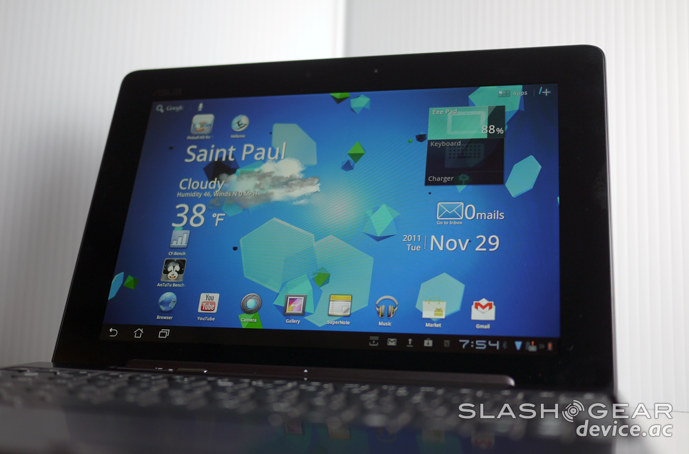 The tablet is cold to the touch most of the time because of its entirely aluminum back, and the glass along the front has a nearly up to the edge coverage, making the whole tablet seem rather refined in its industrial design. The back camera boasts an impressive 8-megapixel rating and has a single LED flash, an upgrade on both accounts when you compare this device to most of the rest of the tablet selection out on the market today, including the first generation Transformer.