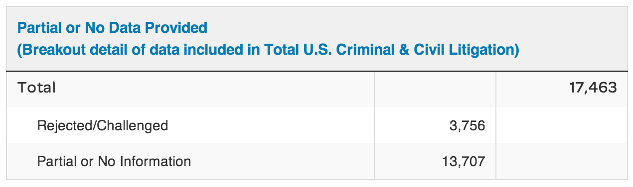It's AT&T up next with their transparency report regarding the United States Department of Justice and the amount of demands they've been sent over the past year. These demands are of several different varieties, one category for National Security, another for U.S. Criminal & Civil Litigation Demands. While National Security demands are still stuck in the stacks between zero and nine-hundred and ninety-nine, localized crime searching is a bit more specific.