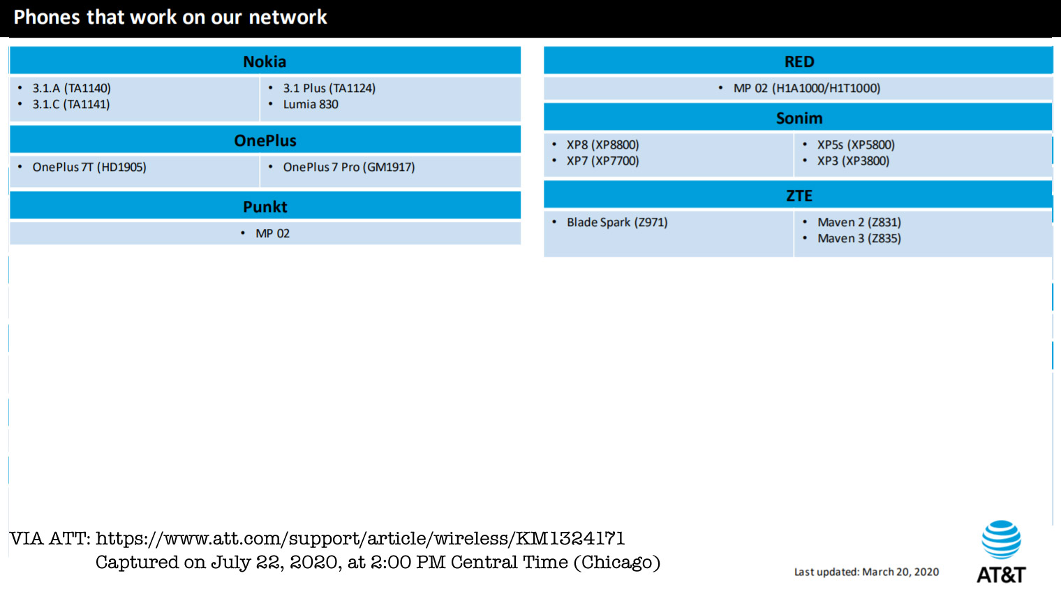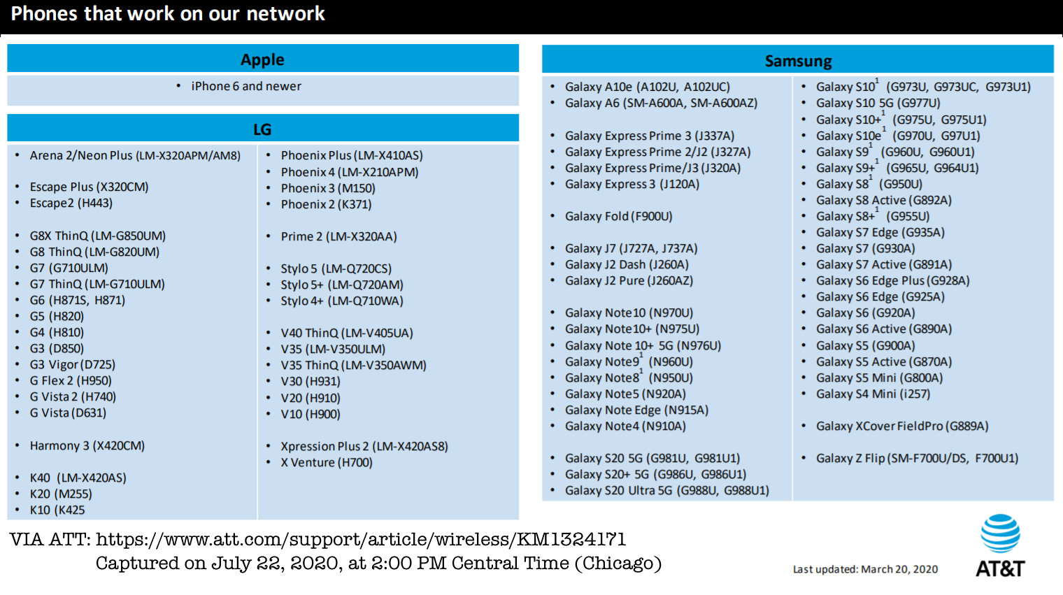 *This does not include every single AT&T user. It only includes "3G devices and 4G wireless devices that don't support HD Voice." If you own an iPhone that's older than the iPhone 6, you'll need a new device. AT&T included a long list of phones that work on their network as of March 20, 2020, from Apple, LG, Samsung, Alcatel, BlackBerry, Cricket, Essential, Google, Microsoft, Motorola, Kyocera, Huawei, Nokia, OnePlus Punkt, RED, Sonim, ZTE, and HTC.