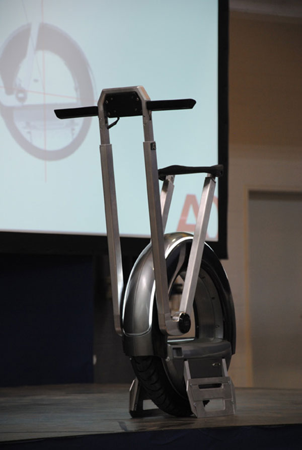 It uses a hubless wheel and is intended to be used along with a car. I guess the idea is that you could park your car and then ride the A0 to your final destination. It looks terribly uncomfortable with its little slightly padded seat. If this looks like a design concept to you, check out the video to see it in action. The A0 is small enough to fold and fit into the trunk of a car.