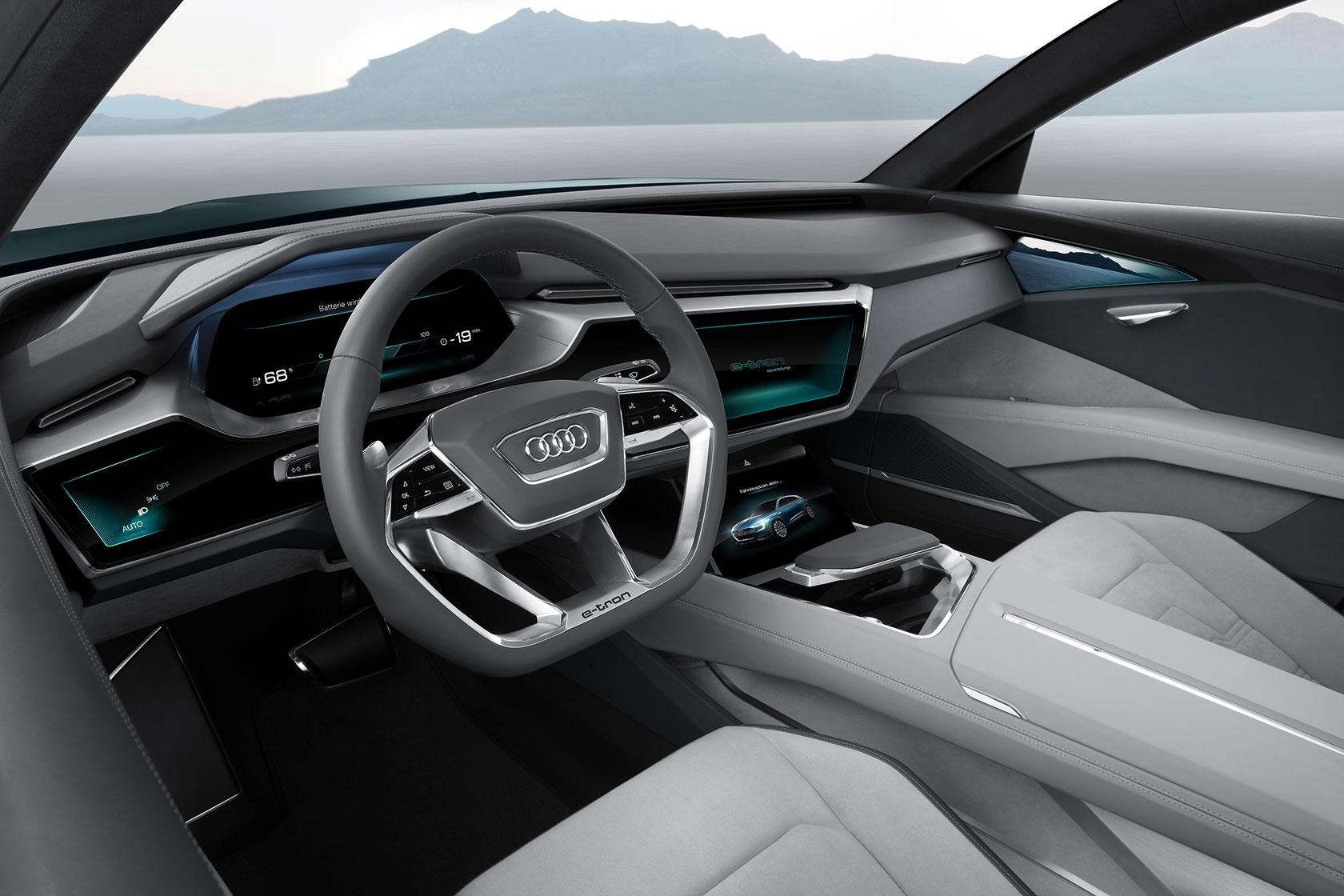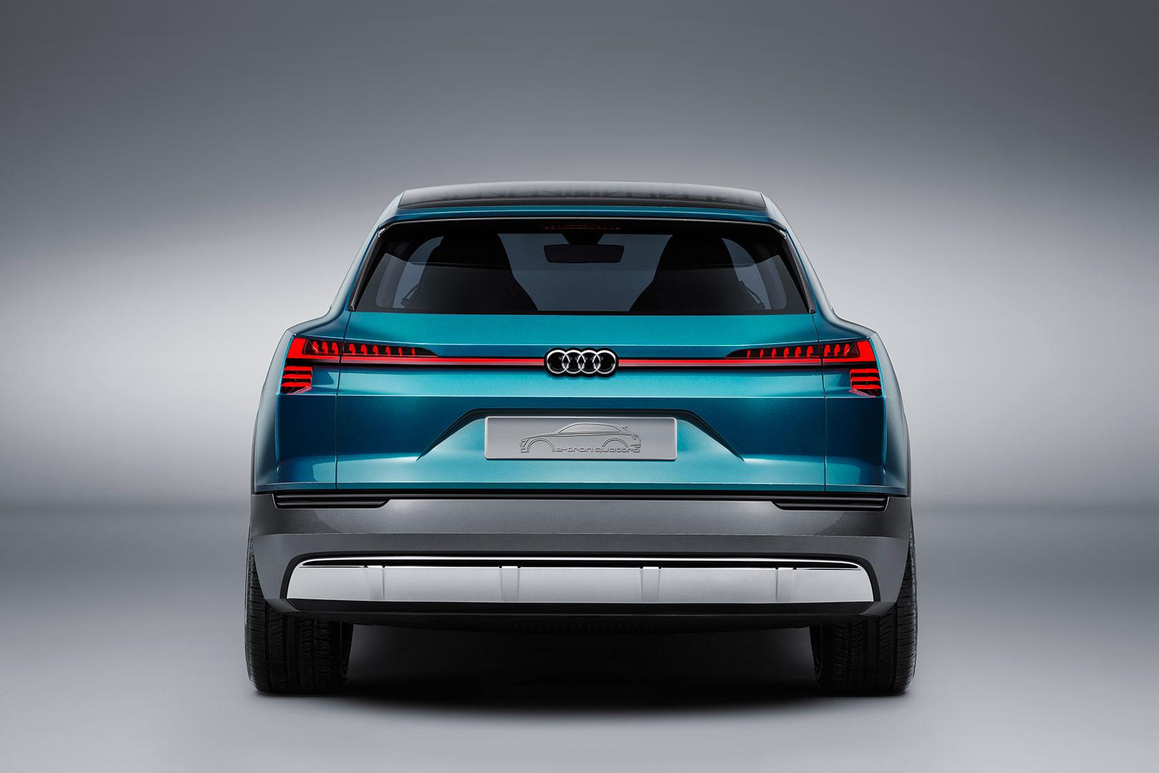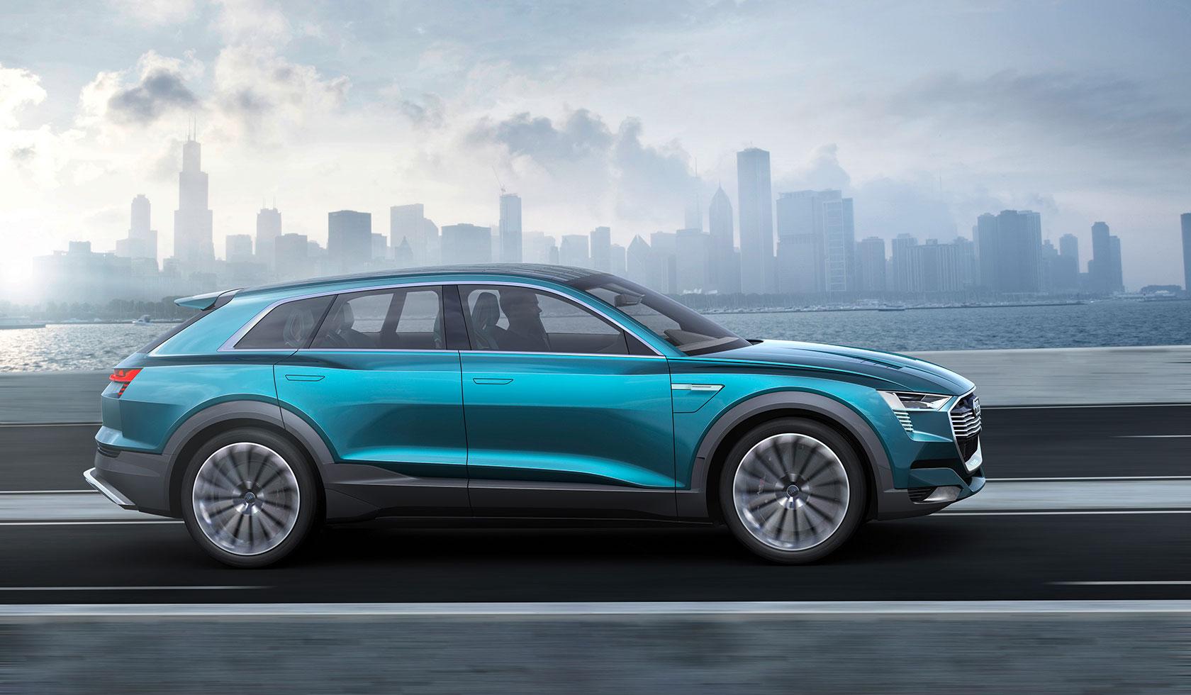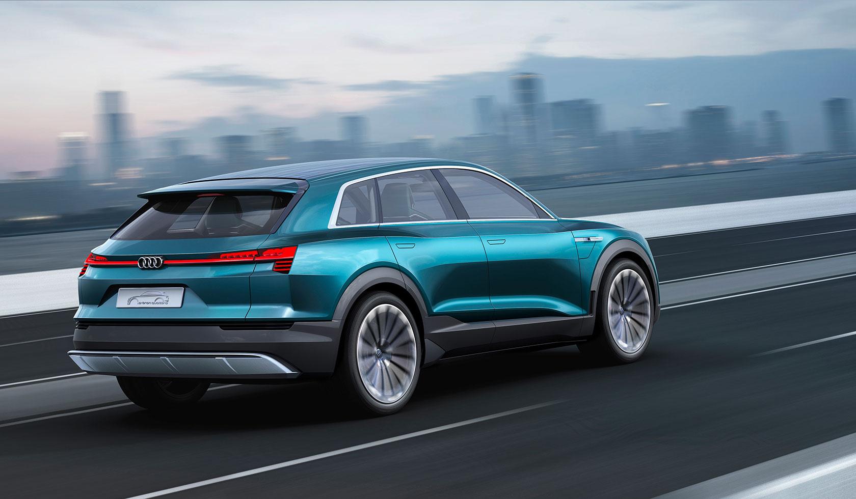 The Audi e-tron Quattro Concept vehicle has been shown in detail this week at the Frankfurt Auto Show 2015. This vehicle works with an electric drivetrain up to 370 kW and has a front-end electric motor, rear electric motors, and a liquid cooled lithium-ion battery with 95 kWh underneath.
