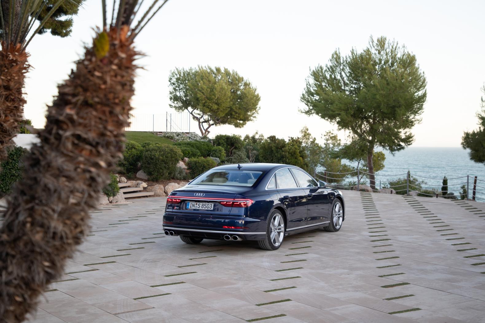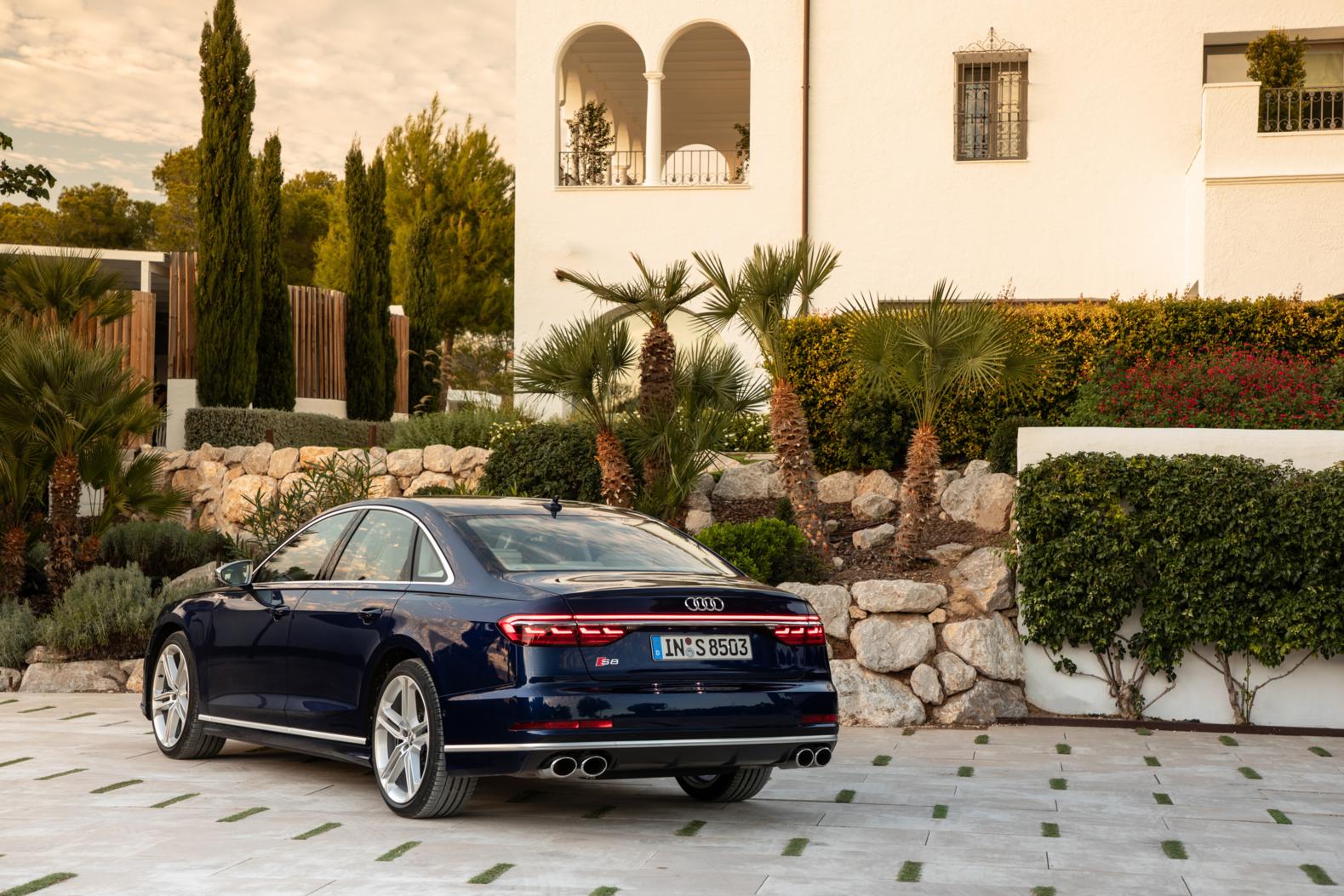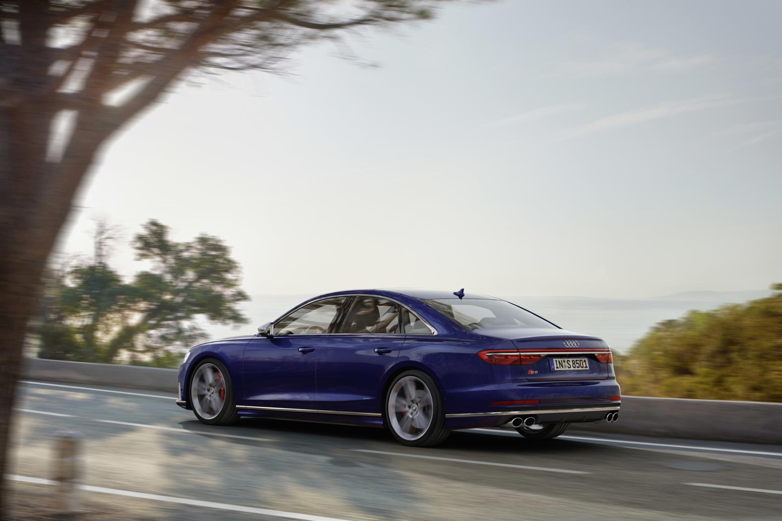 The top speed for the S8 is limited to 155.3 mph, and the car can reach 62.1 mph from a stop in 3.8 seconds. The car also has automatically actuated flaps in the exhaust system for improved sound. The mild-hybrid system uses a 48V belt alternator starter and an additional lithium-ion battery to enable coasting with the engine switched off.