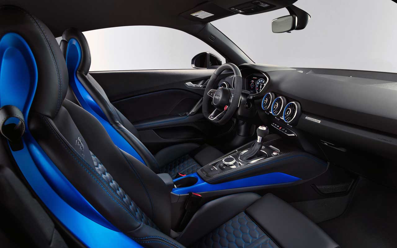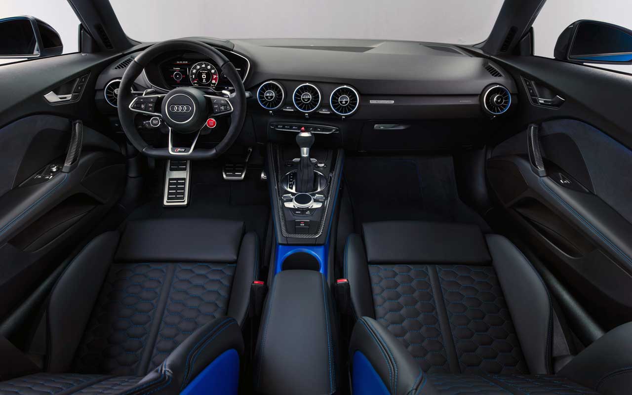 TT RS buyers can choose eight different colors including the new RS-specific color Kayalami green and new colors Pulse orange and Turbo blue. Audi will offer matte aluminum and gloss black styling packages. The RS Coupe weighs 3,196.7 pounds and rolls on 19 or 20-inch wheels.