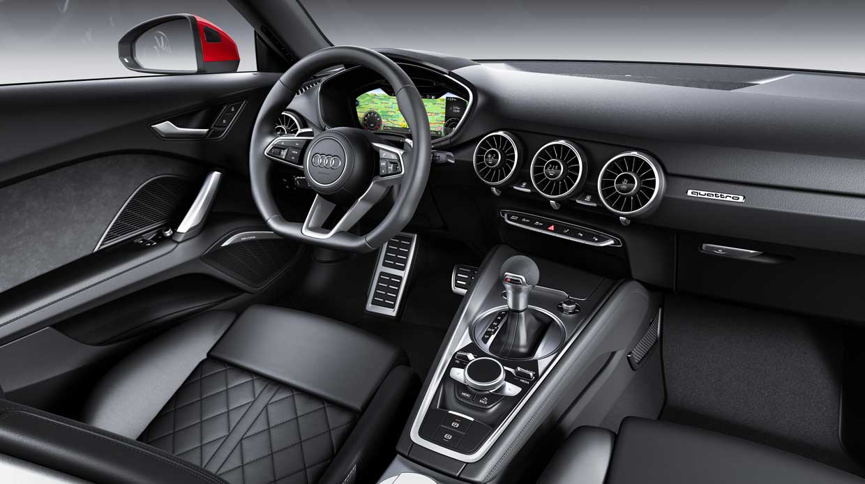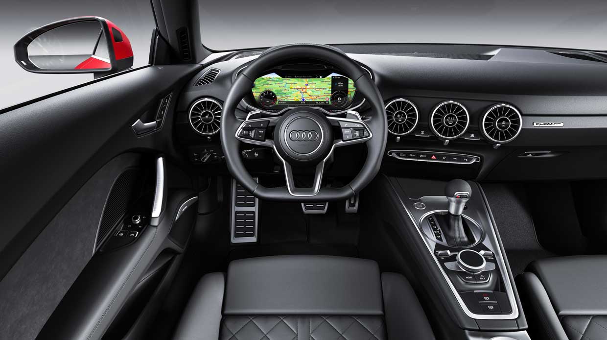 TT buyers now get the Audi virtual cockpit. Even the most basic TT now has the Audi select dynamic handling system, rain, and light sensors, heated outside mirrors, multifunction steering wheel plus, and an infotainment system with voice control. Illuminated USB ports are standard along with Bluetooth on the entire TT range.