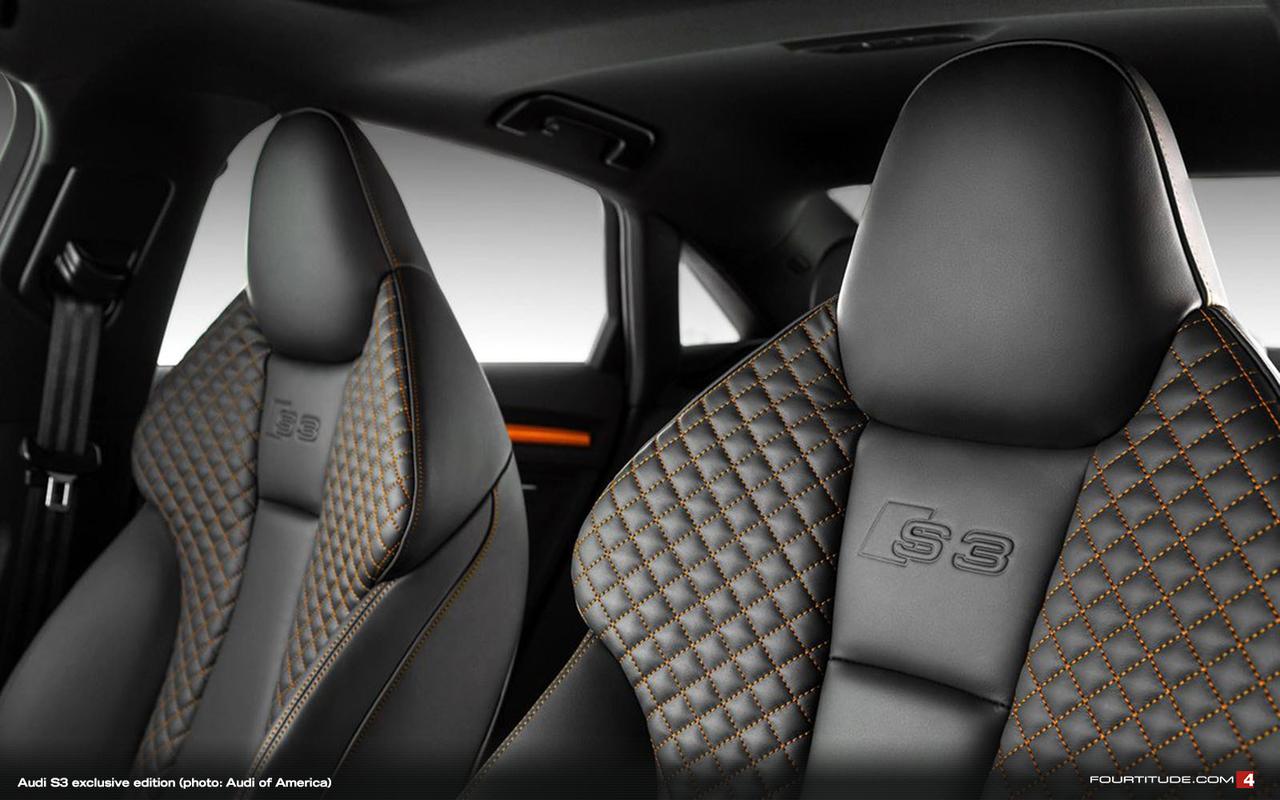 Fine Nappa leather. Audi exclusive leather with contrast stitching that cover door arm rests and knee pads. Audi exclusive leather with contrast stitching on the wheel and gear shift. S Sports seats. And an Audi exclusive inlay that will match the body color of that particular car.