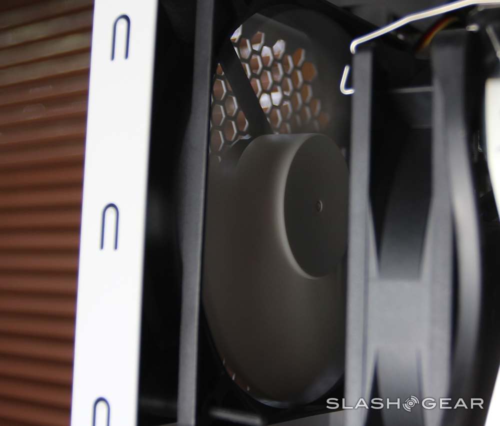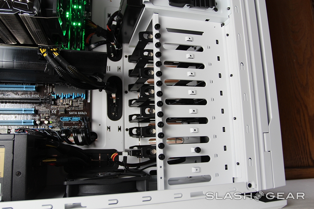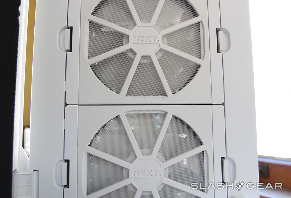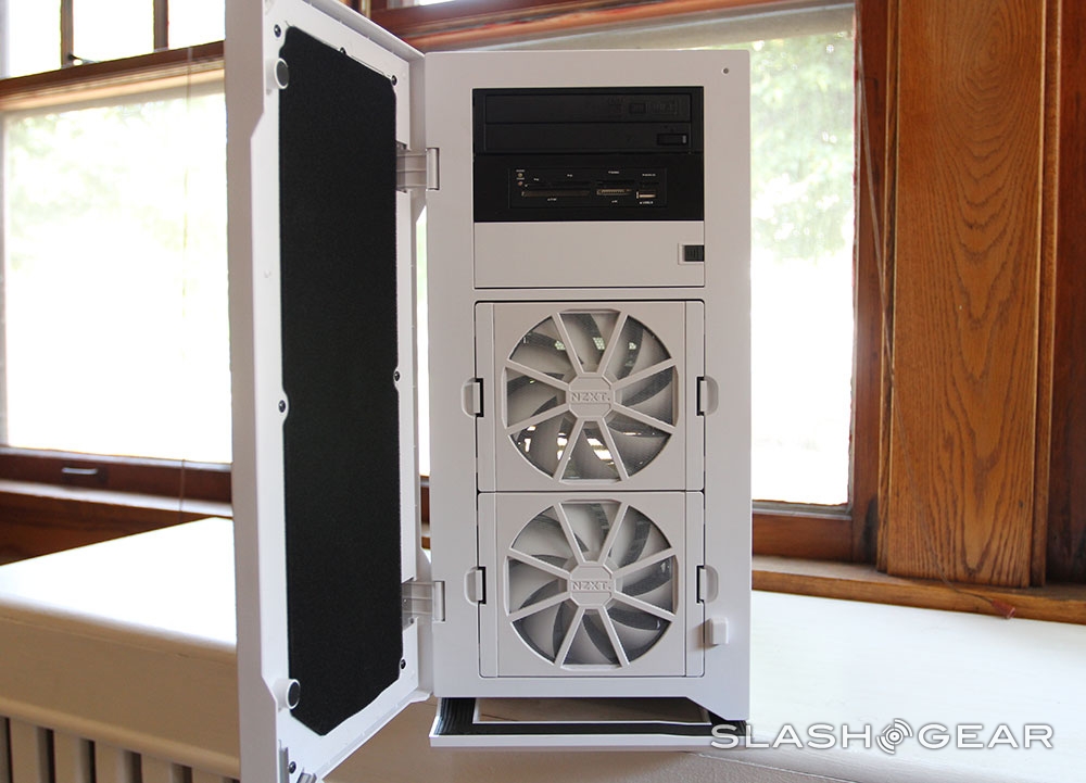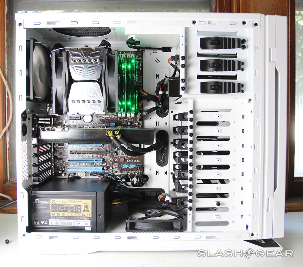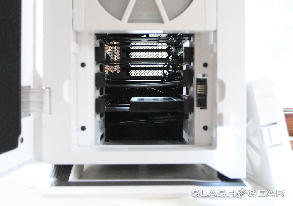 This case is massive, gigantic, and certainly not made for hauling around to LAN parties – there's no handles here, folks. Instead this machine is made to remain stationary, made with so many fans and air ducts that it'll never, ever get hot (it might, but we've not seen it yet), and it's clean. This machine looks fabulous, with a classy white combination of plastic and metal parts and safety bumpers all around so there's no clunks or clanks when you're opening or shutting doors.