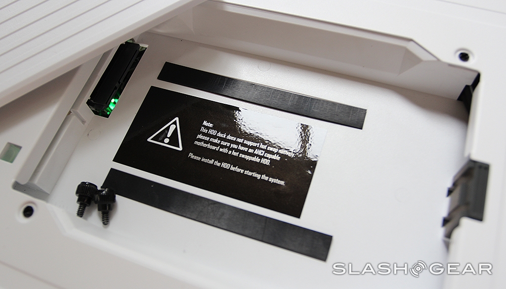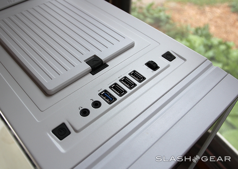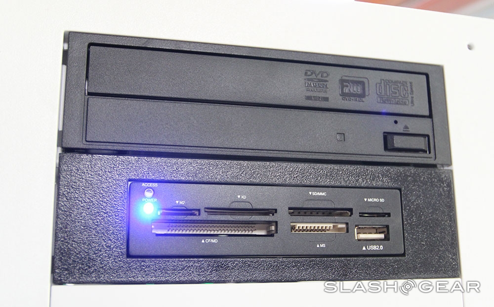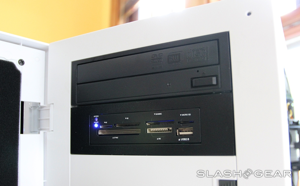 The front of the machine has a flat aluminum shape to it with a couple of peek-holes you'll be able to see in the hands-on look at the machine in the video above. This front panel is a door which reveals your DVD drive, memory card ports, and whatever else you want to attach in the racks on racks on racks available throughout the front of the machine. This machine comes with room for so much customizability right out of the box it's absurd.