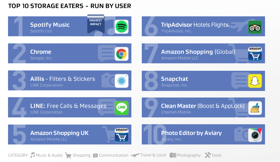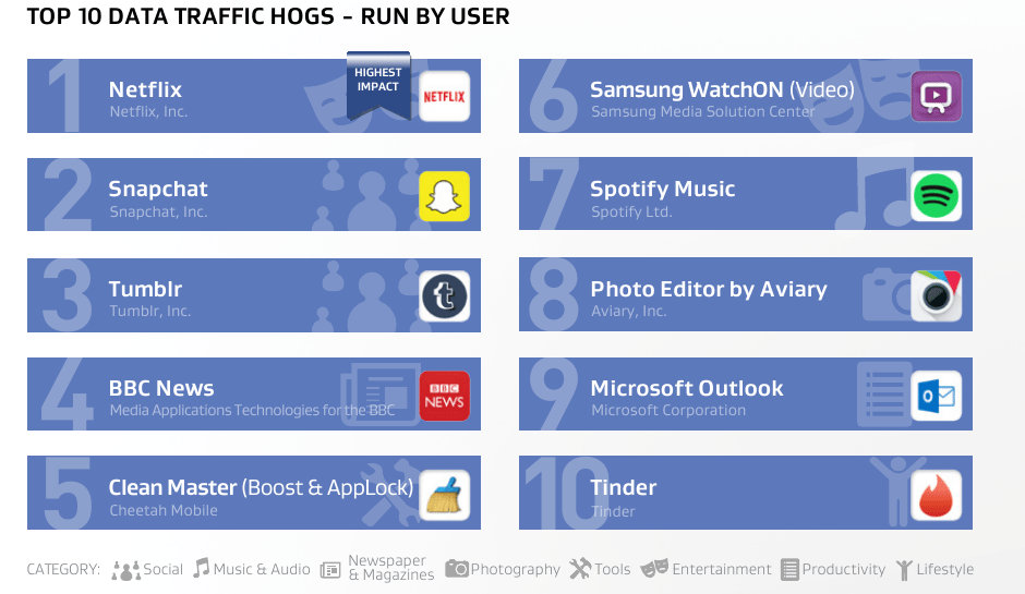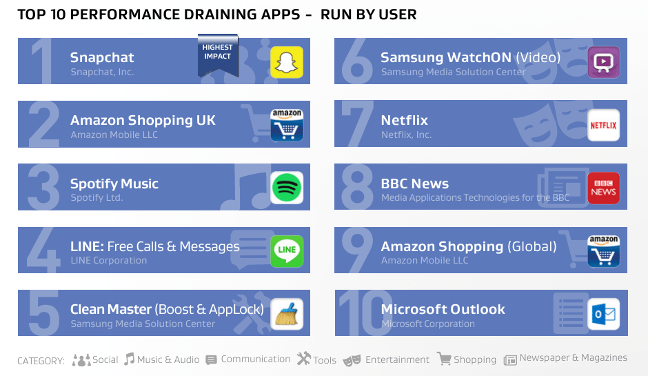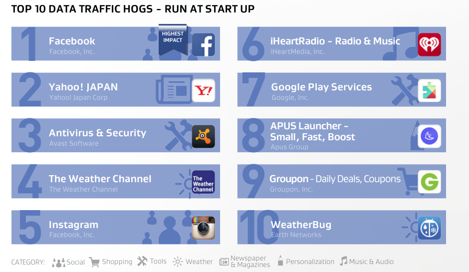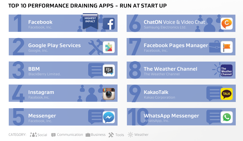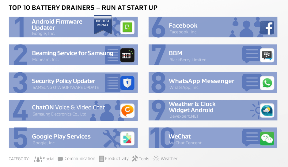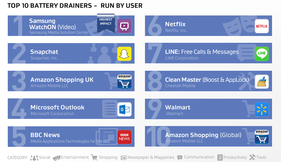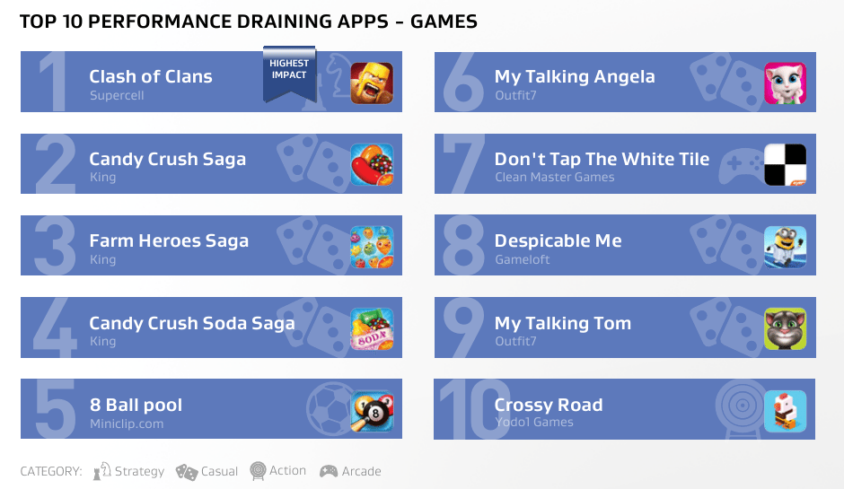 And then we got to the games. Games are, by nature, phone drainers, but discovering which ones are the top culprits is still an interesting exercise in market analysis. Of course, you'd have the ever popular (for now) Clash of Clans, but apparently games like My Talking Tom and My Talking Angela have snuck into the top 10 after being on vacation for quite a while. These "Tamagochi-like" games, as AVG calls them, drain resources because of their constant need to be used. Because you wouldn't want to be held responsible for hurting cats, right?