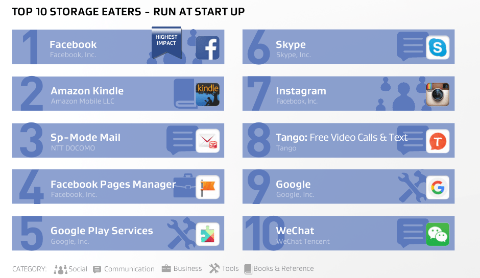 As for the other apps, there's WhatsApp and KakaoTalk, both messaging apps, tenerting the Top 10 overall performance black holes. Interestingly, Google Play Store remains one of the top battery drainers of all time. And as for your data storage chompers, you might be surprised to realize that it is Facebook and Kindle who top the list.