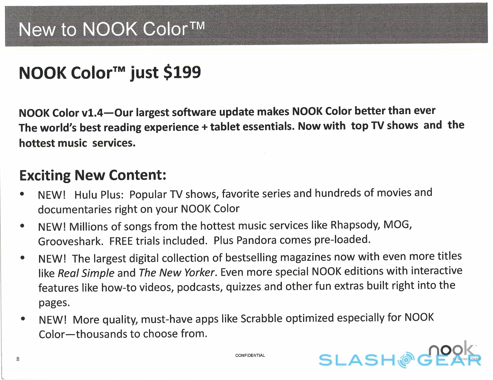 Other than that, there's a bump in NOOK Color software in that it now features Hulu Plus, you've now got access to Rhapsody, MOG, and Grooveshark, and of course Pandora still works as it comes pre-installed. Real Simple and The New Yorker have been added to the Barnes and Noble library, and games such as Scrabble have been added to the basic NOOK Color store of games.