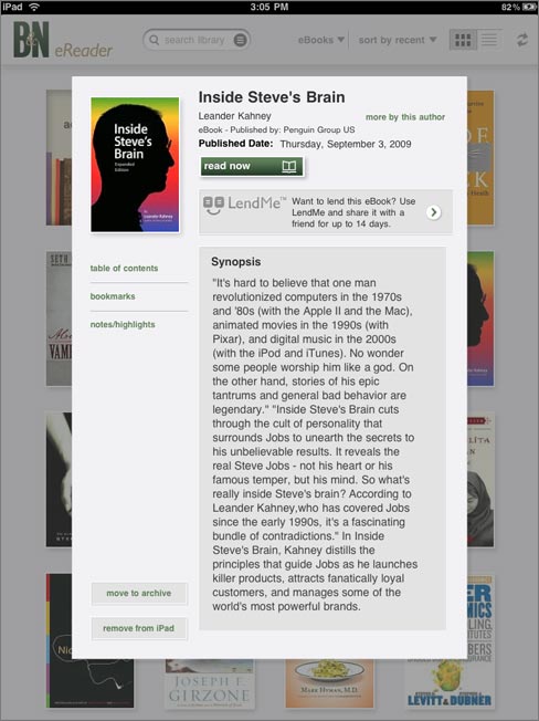 · Take notes: Bookmark pages, make highlights and write notes. Simply tap a word or drag your finger across a section to highlight it or make a note. In addition to appearing on your iPad, your bookmarks, highlights and notes will also appear on iPad and PC enabled with BN eReader software. iPhone and iPod touch will be added soon, followed by other devices.