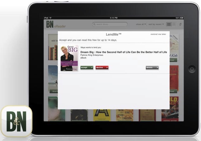 The LendMe experience was designed to be seamlessly integrated with the iPad. BN eReader for iPad users can simply choose an eligible eBook flagged with the LendMe icon, then access their existing contacts in iPad's onboard address book, tap the contact and send the lend offer — all without needing to type a single word. The friend can accept the offer and enjoy the eBook for up to 14 days, a unique feature offered only by Barnes & Noble. And BN eReader for iPad users will receive LendMe offers from friends within the application, showing them the eBook's cover and the message from their friend.