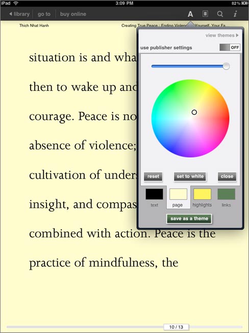 BN eReader for iPad is designed to offer an easy, yet sophisticated, customizable reading experience. Users can choose from multiple ways to view their library, including professionally designed themes with elegant and complementary text and page colors, as well as fonts; and instantly switch between portrait and landscape views based on personal preference. BN eReader for iPad users can further personalize their reading experience with unparalleled options: literally millions of colors for text, pages, highlights and links; eight typefaces and five text sizes; and a variety of margins and customizable spacing options. Learn more or get the new application at www.bn.com/iPad.